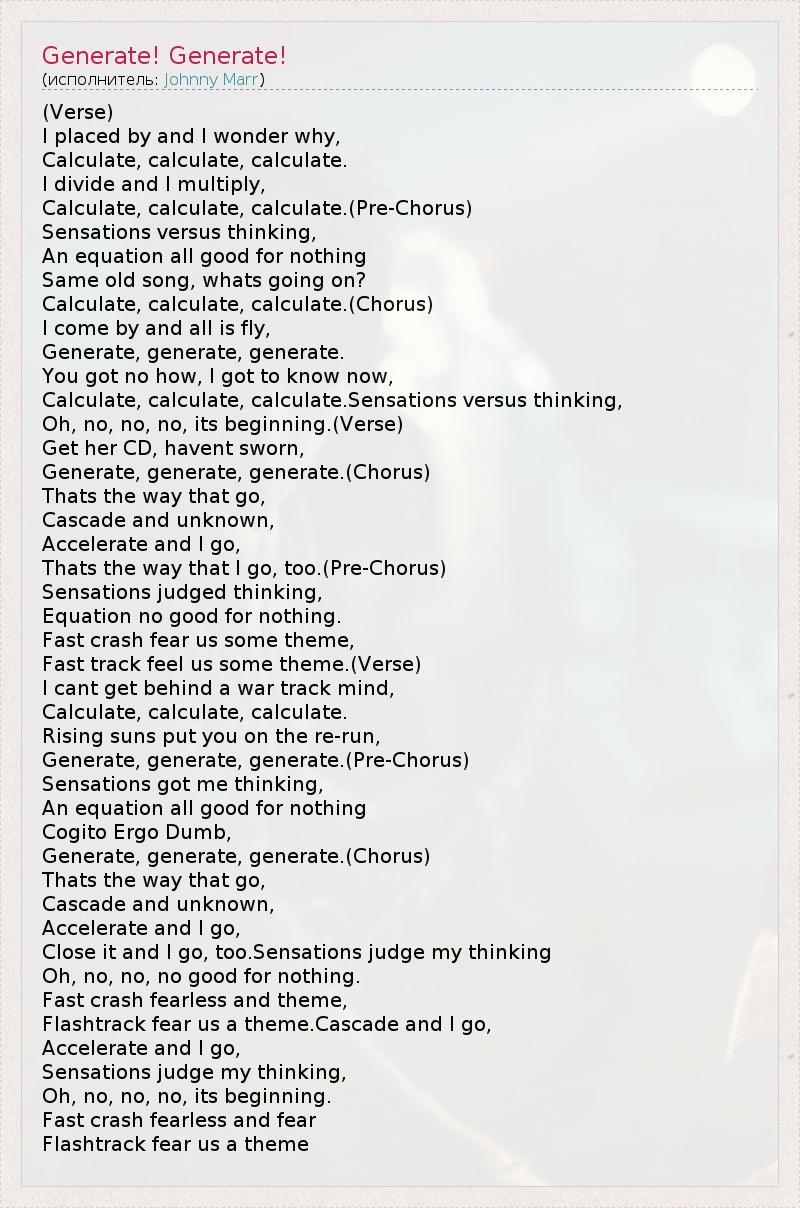 (Verse) I placed by and I wonder why, Calculate, calculate, calculate. I divide and I multiply, Calculate, calculate, calculate.(Pre-Chorus) Sensations versus thinking, An equation all good for nothing Same old song, whats going on? Calculate, calculate, calculate.(Chorus) I come by and all is fly, Generate, generate, generate. You got no how, I got to know now, Calculate, calculate, calculate.Sensations versus thinking, Oh, no, no, no, its beginning.(Verse) Get her CD, havent sworn, Generate, generate, generate.(Chorus) Thats the way that go, Cascade and unknown, Accelerate and I go, Thats the way that I go, too.(Pre-Chorus) Sensations judged thinking, Equation no good for nothing. Fast crash fear us some theme, Fast track feel us some theme.(Verse) I cant get behind a war track mind, Calculate, calculate, calculate. Rising suns put you on the re-run, Generate, generate, generate.(Pre-Chorus) Sensations got me thinking, An equation all good for nothing Cogito Ergo Dumb, Generate, generate, generate.(Chorus) Thats the way that go, Cascade and unknown, Accelerate and I go, Close it and I go, too.Sensations judge my thinking Oh, no, no, no good for nothing. Fast crash fearless and theme, Flashtrack fear us a theme.Cascade and I go, Accelerate and I go, Sensations judge my thinking, Oh, no, no, no, its beginning. Fast crash fearless and fear Flashtrack fear us a theme