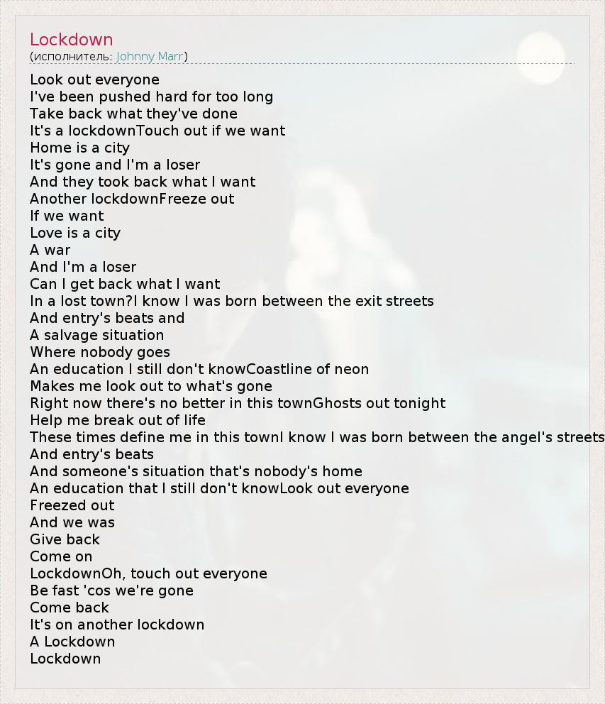 Look out everyone I've been pushed hard for too long Take back what they've done It's a lockdownTouch out if we want Home is a city It's gone and I'm a loser And they took back what I want Another lockdownFreeze out If we want Love is a city A war And I'm a loser Can I get back what I want In a lost town?I know I was born between the exit streets And entry's beats and A salvage situation Where nobody goes An education I still don't knowCoastline of neon Makes me look out to what's gone Right now there's no better in this townGhosts out tonight Help me break out of life These times define me in this townI know I was born between the angel's streets And entry's beats And someone's situation that's nobody's home An education that I still don't knowLook out everyone Freezed out And we was Give back Come on LockdownOh, touch out everyone Be fast 'cos we're gone Come back It's on another lockdown A Lockdown Lockdown