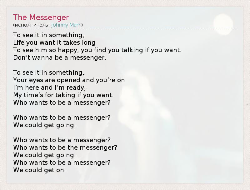To see it in something, Life you want it takes long To see him so happy, you find you talking if you want. Don’t wanna be a messenger. To see it in something, Your eyes are opened and you’re on I’m here and I’m ready, My time’s for taking if you want. Who wants to be a messenger? Who wants to be a messenger? We could get going. Who wants to be a messenger? Who wants to be the messenger? We could get going. Who wants to be a messenger? We could get on.
