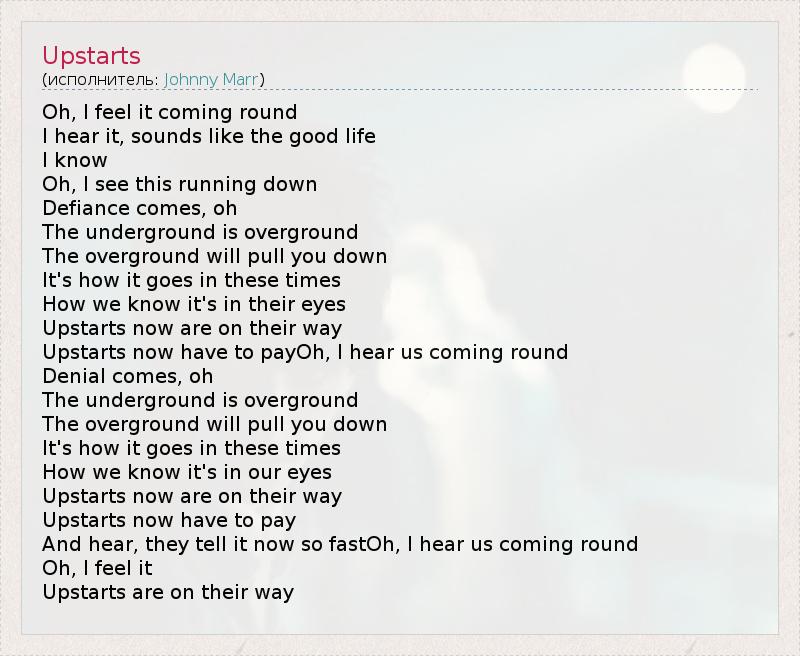 Oh, I feel it coming round I hear it, sounds like the good life I know Oh, I see this running down Defiance comes, oh The underground is overground The overground will pull you down It's how it goes in these times How we know it's in their eyes Upstarts now are on their way Upstarts now have to payOh, I hear us coming round Denial comes, oh The underground is overground The overground will pull you down It's how it goes in these times How we know it's in our eyes Upstarts now are on their way Upstarts now have to pay And hear, they tell it now so fastOh, I hear us coming round Oh, I feel it Upstarts are on their way