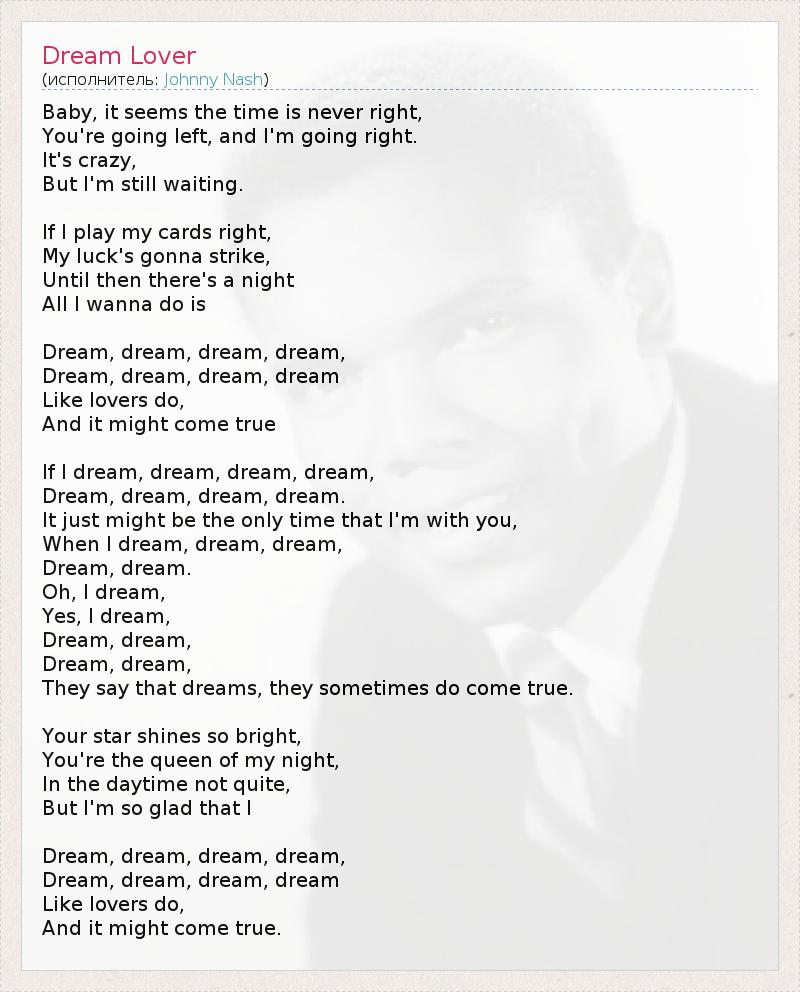 Милая, кажется, время не бывает подходящим, Ты идёшь налево, а я направо. Это просто безумие, Но я всё ещё жду. Если я правильно разыграю свои карты, Мне улыбнётся удача, И пока не наступит ночь, Я хочу лишь... Мечтать, мечтать, мечтать, мечтать, Мечтать, мечтать, мечтать, мечтать, Как это делают влюблённые, И мечта может осуществиться, Если я мечтаю, мечтаю, мечтаю, мечтаю, Мечтаю, мечтаю, мечтаю, мечтаю. Наверное, только там я вместе с тобой, В мечтах, в мечтах, в мечтах, В мечтах, в мечтах. О, я мечтаю, Да, я мечтаю, Мечтаю, мечтаю, Мечтаю, мечтаю, Про мечты говорят, что они иногда сбываются. Твоя звёзда сияет так ярко, Ты королева моей ночи, Днём это не совсем так, Но я так рад, что Мечтаю, мечтаю, мечтаю, мечтаю, Мечтаю, мечтаю, мечтаю, мечтаю, Как это делают влюблённые, И мечта может осуществиться.