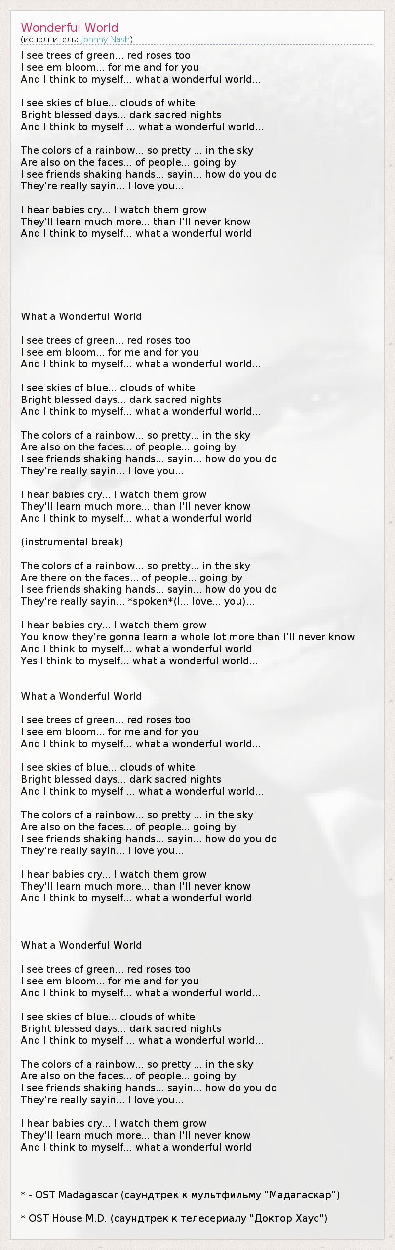 I see trees of green... red roses too I see em bloom... for me and for you And I think to myself... what a wonderful world... I see skies of blue... clouds of white Bright blessed days... dark sacred nights And I think to myself ... what a wonderful world... The colors of a rainbow... so pretty ... in the sky Are also on the faces... of people... going by I see friends shaking hands... sayin... how do you do They're really sayin... I love you... I hear babies cry... I watch them grow They'll learn much more... than I'll never know And I think to myself... what a wonderful world What a Wonderful World I see trees of green... red roses too I see em bloom... for me and for you And I think to myself... what a wonderful world... I see skies of blue... clouds of white Bright blessed days... dark sacred nights And I think to myself... what a wonderful world... The colors of a rainbow... so pretty... in the sky Are also on the faces... of people... going by I see friends shaking hands... sayin... how do you do They're really sayin... I love you... I hear babies cry... I watch them grow They'll learn much more... than I'll never know And I think to myself... what a wonderful world (instrumental break) The colors of a rainbow... so pretty... in the sky Are there on the faces... of people... going by I see friends shaking hands... sayin... how do you do They're really sayin... *spoken*(I... love... you)... I hear babies cry... I watch them grow You know they're gonna learn a whole lot more than I'll never know And I think to myself... what a wonderful world Yes I think to myself... what a wonderful world... What a Wonderful World I see trees of green... red roses too I see em bloom... for me and for you And I think to myself... what a wonderful world... I see skies of blue... clouds of white Bright blessed days... dark sacred nights And I think to myself ... what a wonderful world... The colors of a rainbow... so pretty ... in the sky Are also on the faces... of people... going by I see friends shaking hands... sayin... how do you do They're really sayin... I love you... I hear babies cry... I watch them grow They'll learn much more... than I'll never know And I think to myself... what a wonderful world What a Wonderful World I see trees of green... red roses too I see em bloom... for me and for you And I think to myself... what a wonderful world... I see skies of blue... clouds of white Bright blessed days... dark sacred nights And I think to myself ... what a wonderful world... The colors of a rainbow... so pretty ... in the sky Are also on the faces... of people... going by I see friends shaking hands... sayin... how do you do They're really sayin... I love you... I hear babies cry... I watch them grow They'll learn much more... than I'll never know And I think to myself... what a wonderful world * - OST Madagascar (cаундтрек к мультфильму "Мадагаскар") * OST House M.D. (саундтрек к телесериалу "Доктор Хаус")