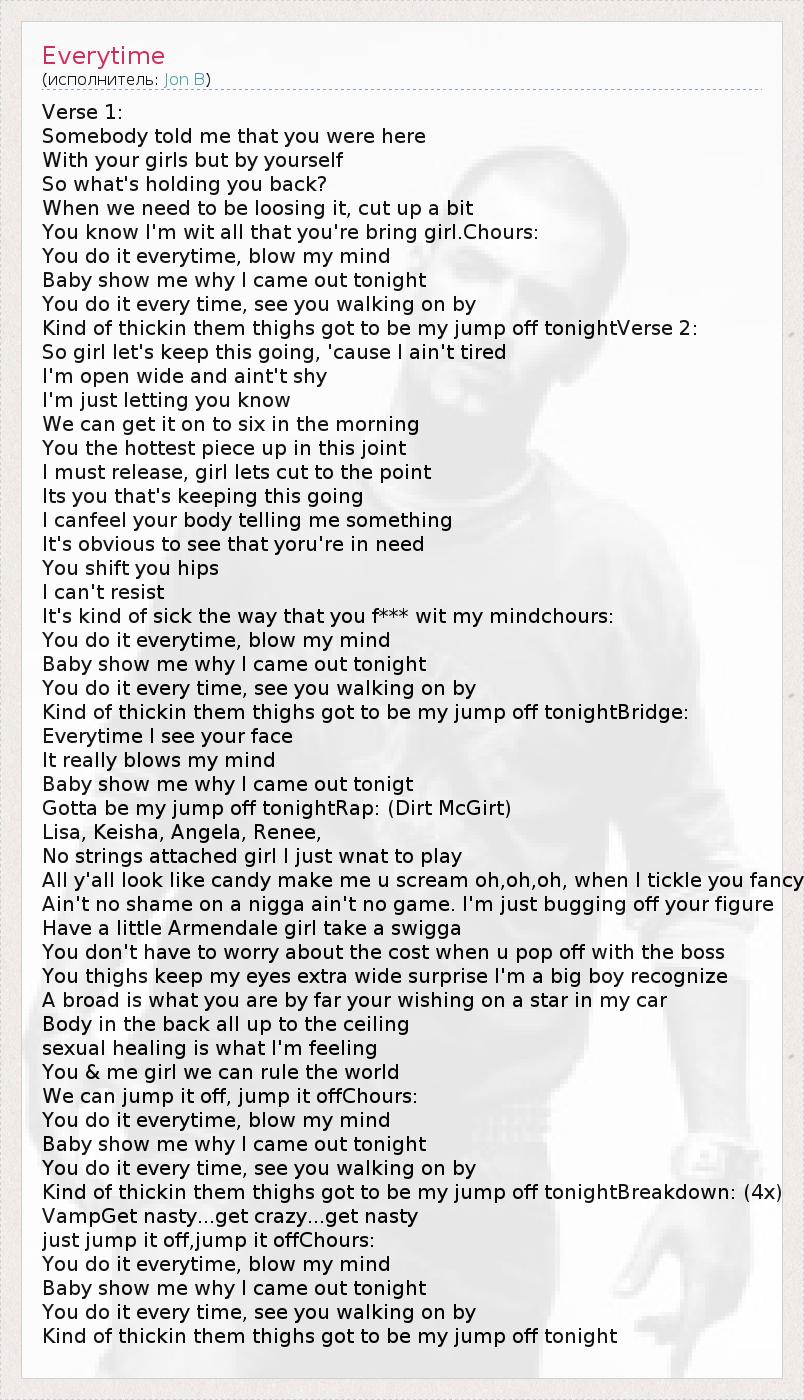 Verse 1: Somebody told me that you were here With your girls but by yourself So what's holding you back? When we need to be loosing it, cut up a bit You know I'm wit all that you're bring girl.Chours: You do it everytime, blow my mind Baby show me why I came out tonight You do it every time, see you walking on by Kind of thickin them thighs got to be my jump off tonightVerse 2: So girl let's keep this going, 'cause I ain't tired I'm open wide and aint't shy I'm just letting you know We can get it on to six in the morning You the hottest piece up in this joint I must release, girl lets cut to the point Its you that's keeping this going I canfeel your body telling me something It's obvious to see that yoru're in need You shift you hips I can't resist It's kind of sick the way that you f*** wit my mindchours: You do it everytime, blow my mind Baby show me why I came out tonight You do it every time, see you walking on by Kind of thickin them thighs got to be my jump off tonightBridge: Everytime I see your face It really blows my mind Baby show me why I came out tonigt Gotta be my jump off tonightRap: (Dirt McGirt) Lisa, Keisha, Angela, Renee, No strings attached girl I just wnat to play All y'all look like candy make me u scream oh,oh,oh, when I tickle you fancy Ain't no shame on a nigga ain't no game. I'm just bugging off your figure Have a little Armendale girl take a swigga You don't have to worry about the cost when u pop off with the boss You thighs keep my eyes extra wide surprise I'm a big boy recognize A broad is what you are by far your wishing on a star in my car Body in the back all up to the ceiling sexual healing is what I'm feeling You & me girl we can rule the world We can jump it off, jump it offChours: You do it everytime, blow my mind Baby show me why I came out tonight You do it every time, see you walking on by Kind of thickin them thighs got to be my jump off tonightBreakdown: (4x) VampGet nasty...get crazy...get nasty just jump it off,jump it offChours: You do it everytime, blow my mind Baby show me why I came out tonight You do it every time, see you walking on by Kind of thickin them thighs got to be my jump off tonight