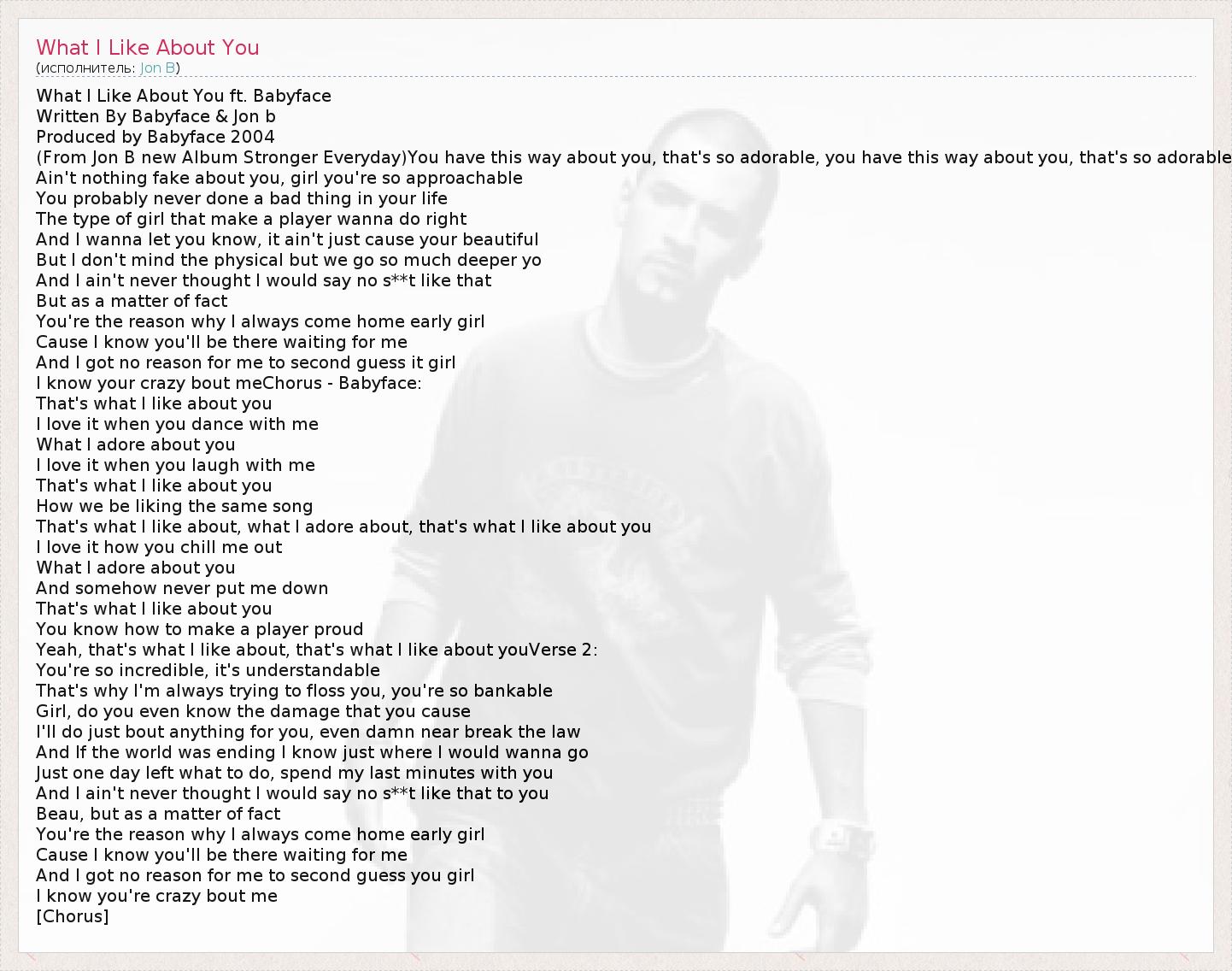 What I Like About You ft. Babyface Written By Babyface & Jon b Produced by Babyface 2004 (From Jon B new Album Stronger Everyday)You have this way about you, that's so adorable, you have this way about you, that's so adorable Ain't nothing fake about you, girl you're so approachable You probably never done a bad thing in your life The type of girl that make a player wanna do right And I wanna let you know, it ain't just cause your beautiful But I don't mind the physical but we go so much deeper yo And I ain't never thought I would say no s**t like that But as a matter of fact You're the reason why I always come home early girl Cause I know you'll be there waiting for me And I got no reason for me to second guess it girl I know your crazy bout meChorus - Babyface: That's what I like about you I love it when you dance with me What I adore about you I love it when you laugh with me That's what I like about you How we be liking the same song That's what I like about, what I adore about, that's what I like about you I love it how you chill me out What I adore about you And somehow never put me down That's what I like about you You know how to make a player proud Yeah, that's what I like about, that's what I like about youVerse 2: You're so incredible, it's understandable That's why I'm always trying to floss you, you're so bankable Girl, do you even know the damage that you cause I'll do just bout anything for you, even damn near break the law And If the world was ending I know just where I would wanna go Just one day left what to do, spend my last minutes with you And I ain't never thought I would say no s**t like that to you Beau, but as a matter of fact You're the reason why I always come home early girl Cause I know you'll be there waiting for me And I got no reason for me to second guess you girl I know you're crazy bout me [Chorus]