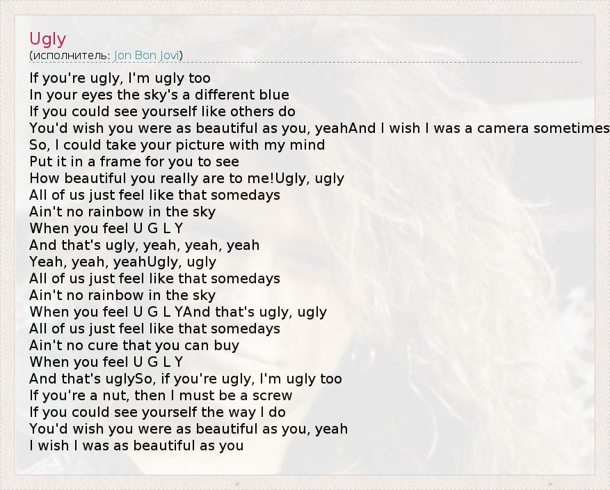 If you're ugly, I'm ugly too In your eyes the sky's a different blue If you could see yourself like others do You'd wish you were as beautiful as you, yeahAnd I wish I was a camera sometimes So, I could take your picture with my mind Put it in a frame for you to see How beautiful you really are to me!Ugly, ugly All of us just feel like that somedays Ain't no rainbow in the sky When you feel U G L Y And that's ugly, yeah, yeah, yeah Yeah, yeah, yeahUgly, ugly All of us just feel like that somedays Ain't no rainbow in the sky When you feel U G L YAnd that's ugly, ugly All of us just feel like that somedays Ain't no cure that you can buy When you feel U G L Y And that's uglySo, if you're ugly, I'm ugly too If you're a nut, then I must be a screw If you could see yourself the way I do You'd wish you were as beautiful as you, yeah I wish I was as beautiful as you
