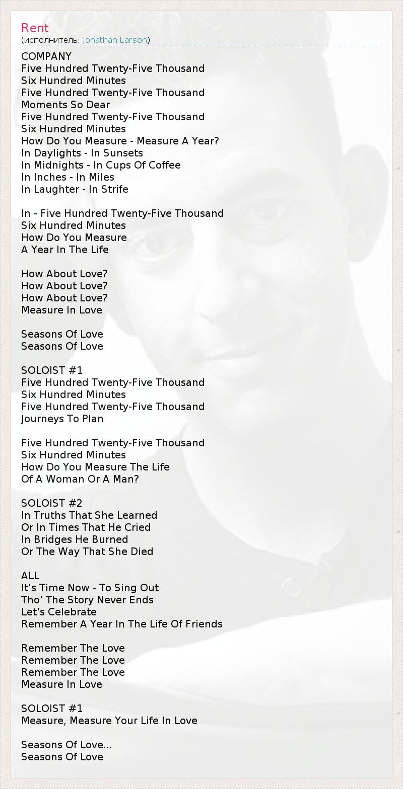 COMPANY Five Hundred Twenty-Five Thousand Six Hundred Minutes Five Hundred Twenty-Five Thousand Moments So Dear Five Hundred Twenty-Five Thousand Six Hundred Minutes How Do You Measure - Measure A Year? In Daylights - In Sunsets In Midnights - In Cups Of Coffee In Inches - In Miles In Laughter - In Strife In - Five Hundred Twenty-Five Thousand Six Hundred Minutes How Do You Measure A Year In The Life How About Love? How About Love? How About Love? Measure In Love Seasons Of Love Seasons Of Love SOLOIST #1 Five Hundred Twenty-Five Thousand Six Hundred Minutes Five Hundred Twenty-Five Thousand Journeys To Plan Five Hundred Twenty-Five Thousand Six Hundred Minutes How Do You Measure The Life Of A Woman Or A Man? SOLOIST #2 In Truths That She Learned Or In Times That He Cried In Bridges He Burned Or The Way That She Died ALL It's Time Now - To Sing Out Tho' The Story Never Ends Let's Celebrate Remember A Year In The Life Of Friends Remember The Love Remember The Love Remember The Love Measure In Love SOLOIST #1 Measure, Measure Your Life In Love Seasons Of Love... Seasons Of Love