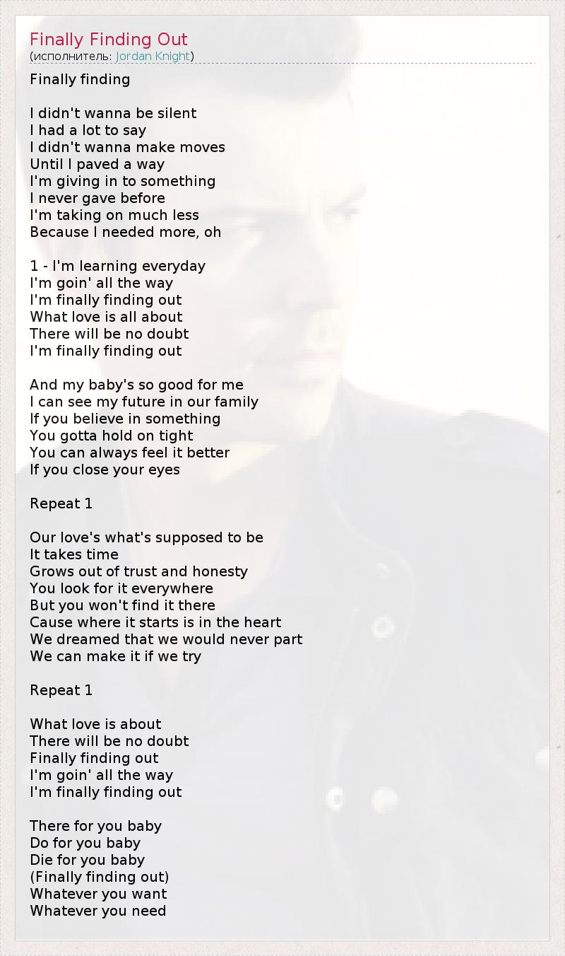 Finally finding I didn't wanna be silent I had a lot to say I didn't wanna make moves Until I paved a way I'm giving in to something I never gave before I'm taking on much less Because I needed more, oh 1 - I'm learning everyday I'm goin' all the way I'm finally finding out What love is all about There will be no doubt I'm finally finding out And my baby's so good for me I can see my future in our family If you believe in something You gotta hold on tight You can always feel it better If you close your eyes Repeat 1 Our love's what's supposed to be It takes time Grows out of trust and honesty You look for it everywhere But you won't find it there Cause where it starts is in the heart We dreamed that we would never part We can make it if we try Repeat 1 What love is about There will be no doubt Finally finding out I'm goin' all the way I'm finally finding out There for you baby Do for you baby Die for you baby (Finally finding out) Whatever you want Whatever you need