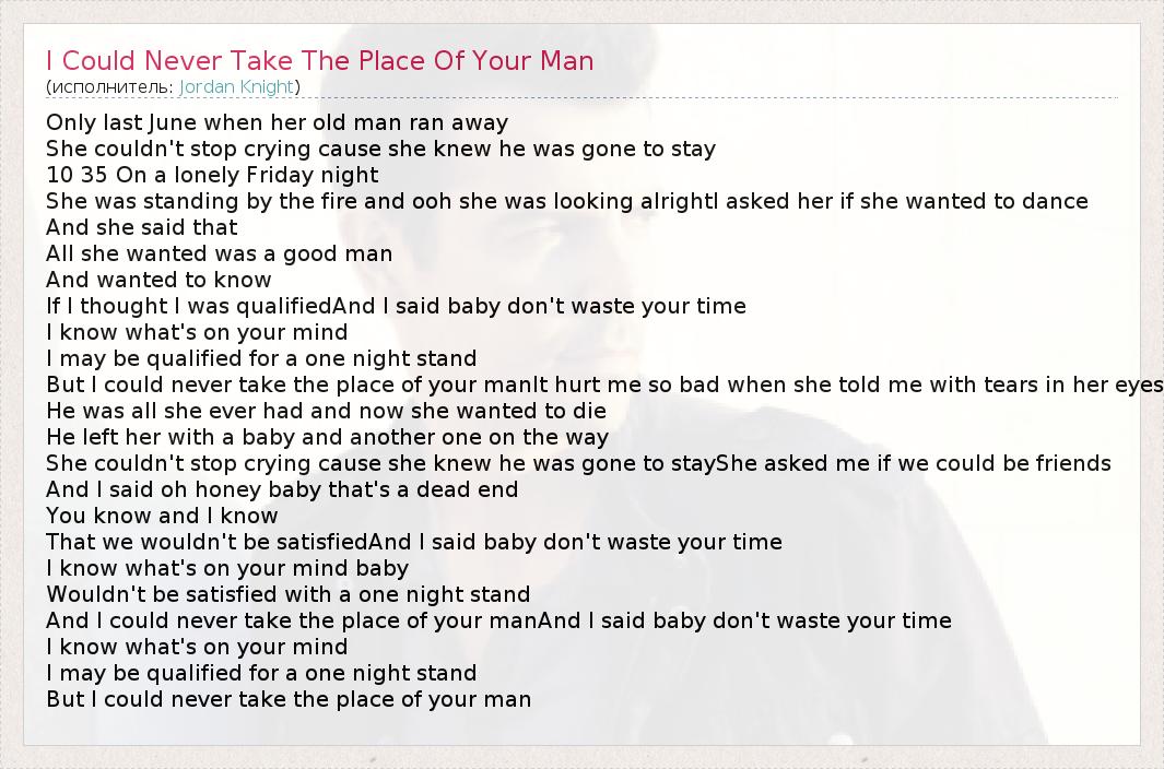 But I could never take the place of your manIt hurt me so bad when she told me with tears in her eyes