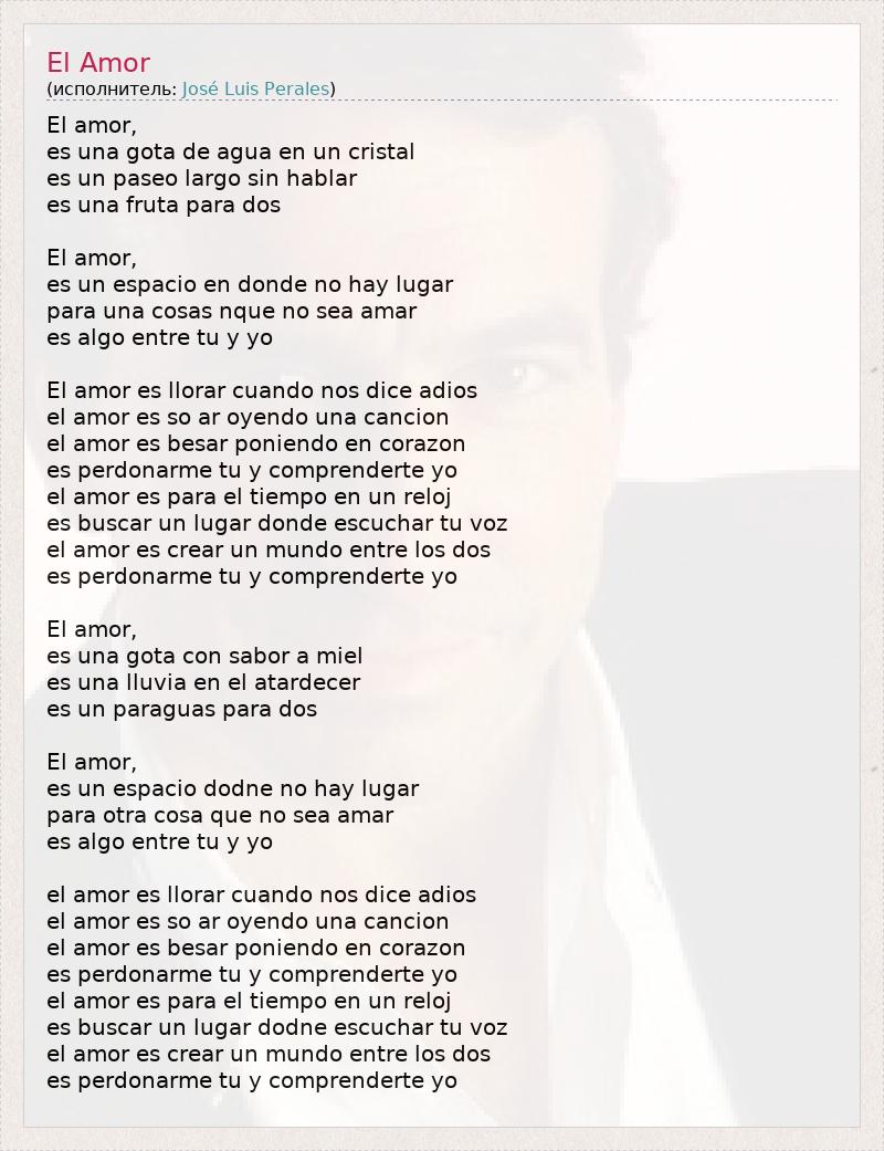 El amor, es una gota de agua en un cristal es un paseo largo sin hablar es una fruta para dos El amor, es un espacio en donde no hay lugar para una cosas nque no sea amar es algo entre tu y yo El amor es llorar cuando nos dice adios el amor es so ar oyendo una cancion el amor es besar poniendo en corazon es perdonarme tu y comprenderte yo el amor es para el tiempo en un reloj es buscar un lugar donde escuchar tu voz el amor es crear un mundo entre los dos es perdonarme tu y comprenderte yo El amor, es una gota con sabor a miel es una lluvia en el atardecer es un paraguas para dos El amor, es un espacio dodne no hay lugar para otra cosa que no sea amar es algo entre tu y yo el amor es llorar cuando nos dice adios el amor es so ar oyendo una cancion el amor es besar poniendo en corazon es perdonarme tu y comprenderte yo el amor es para el tiempo en un reloj es buscar un lugar dodne escuchar tu voz el amor es crear un mundo entre los dos es perdonarme tu y comprenderte yo