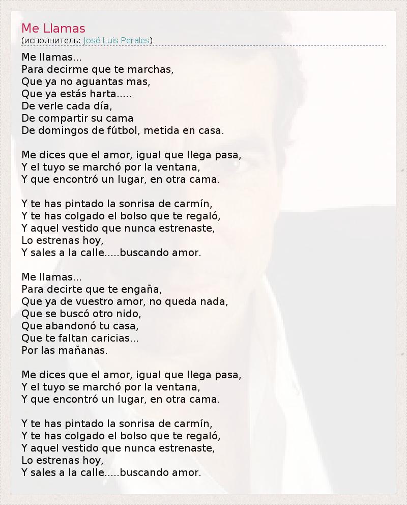 Звонишь мне... Чтобы сказать мне, что ты уходишь, Что не можешь больше, Что сыта по горло... Видеть его каждый день, Делить с ним постель, От воскресного футбола, помещённая в клетку. Говоришь мне, что любовь, как приходит, так и уходит, И твоя ушла через окно, И что он нашёл место в другой постели. И ты накрасила губы красной помадой, И взяла сумку, которую он тебе подарил, И то платье, что никогда не надевала, Надела в первый раз сегодня, И вышла на улицу... искать любовь. Звонишь мне... Чтобы сказать мне, что тебя обманывает, Что от вашей любви уже ничего не осталось, Что искал другое гнездо, Что покинул твой дом, Что тебе не хватает ласки... По утрам. Говоришь мне, что любовь, как приходит, так и уходит, И твоя ушла через окно, И что он нашёл место в другой постели. И ты накрасила губы красной помадой, И взяла сумку, которую он тебе подарил, И то платье, что никогда не надевала, Надела в первый раз сегодня, И вышла на улицу... искать любовь.