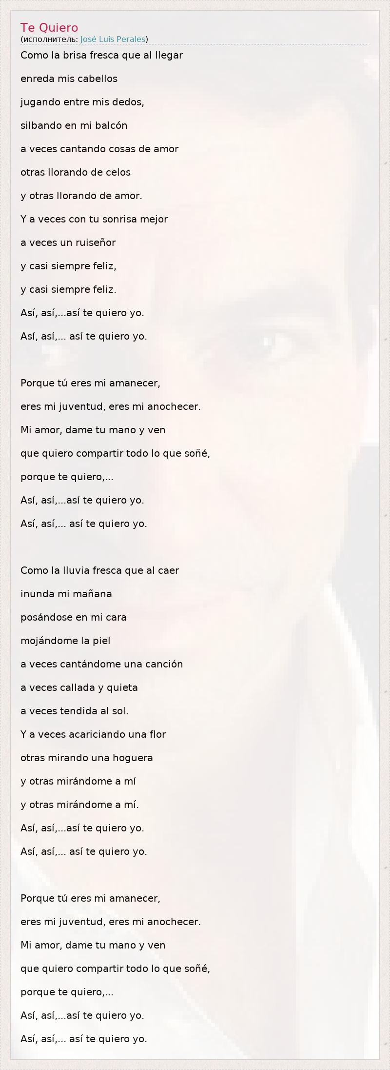 Это интересно:José Luis Perales José Luis Perales Birth name José Luis Perales Morillas Born 28 January 1945 (1945-01-28) (age 66)Castejón, Cuenca, Spain Genres BaladaRomantic music Occupations Musician, Songwriter Instruments Guitar, Vocals Years active 1972-present Labels Hispavox, Sony Music / BMG, Columbia Records Website http://www.joseluisperales.net/ (Spanish) José Luis Perales (born January 28, 1945 in Castejón, Cuenca Province) is a Spanish singer-songwriter and composer who is very popular in Spain and Latin America. He has performed some of his extensive work... продолжение