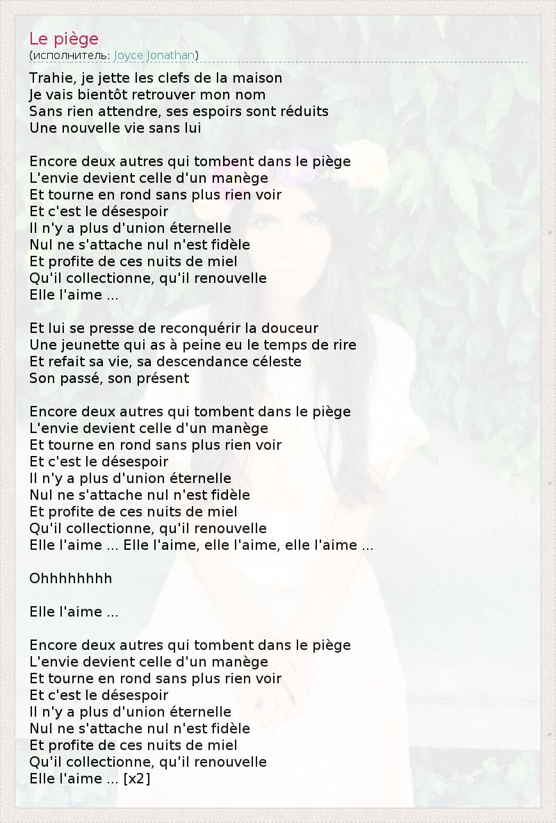 Trahie, je jette les clefs de la maison Je vais bientôt retrouver mon nom Sans rien attendre, ses espoirs sont réduits Une nouvelle vie sans lui Encore deux autres qui tombent dans le piège L'envie devient celle d'un manège Et tourne en rond sans plus rien voir Et c'est le désespoir Il n'y a plus d'union éternelle Nul ne s'attache nul n'est fidèle Et profite de ces nuits de miel Qu'il collectionne, qu'il renouvelle Elle l'aime ... Et lui se presse de reconquérir la douceur Une jeunette qui as à peine eu le temps de rire Et refait sa vie, sa descendance céleste Son passé, son présent Encore deux autres qui tombent dans le piège L'envie devient celle d'un manège Et tourne en rond sans plus rien voir Et c'est le désespoir Il n'y a plus d'union éternelle Nul ne s'attache nul n'est fidèle Et profite de ces nuits de miel Qu'il collectionne, qu'il renouvelle Elle l'aime ... Elle l'aime, elle l'aime, elle l'aime ... Ohhhhhhhh Elle l'aime ... Encore deux autres qui tombent dans le piège L'envie devient celle d'un manège Et tourne en rond sans plus rien voir Et c'est le désespoir Il n'y a plus d'union éternelle Nul ne s'attache nul n'est fidèle Et profite de ces nuits de miel Qu'il collectionne, qu'il renouvelle Elle l'aime ... [x2]