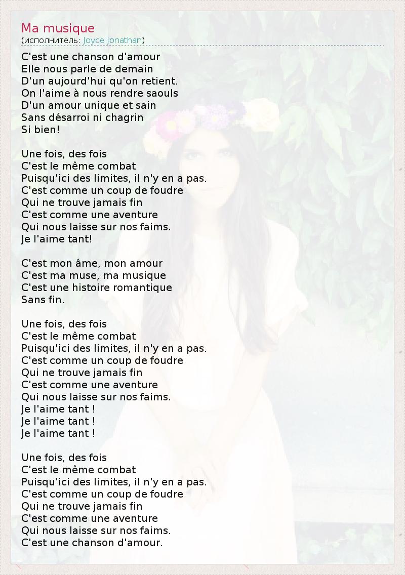 C'est Une шансон d'Amour Elle ноус Parle де Demain D' UN aujourd'hui qu'on retient . На l' Эме à ноус rendre saouls D' UN амур уникальный др Саин Без désarroi Ni огорчение Si Bien ! Une фуа , де фуа C'est ле même боевой Puisqu'ici де Limites , иль n'y ан па . C'est Comme ООН смертельный Foudre Квай пе TROUVE Jamais плавник C'est Comme Une Aventure Квай турами Laisse сюр NOS faims . Je l' Эме Tant ! C'est пн âme , Mon Amour C'est ма муза , ма Musique C'est Une Histoire Романтическая Без плавник . Une фуа , де фуа C'est ле même боевой Puisqu'ici де Limites , иль n'y ан па . C'est Comme ООН смертельный Foudre Квай пе TROUVE Jamais плавник C'est Comme Une Aventure Квай турами Laisse сюр NOS faims . Je l' Эме Tant ! Je l' Эме Tant ! Je l' Эме Tant ! Une фуа , де фуа C'est ле même боевой Puisqu'ici де Limites , иль n'y ан па . C'est Comme ООН смертельный Foudre Квай пе TROUVE Jamais плавник C'est Comme Une Aventure Квай турами Laisse сюр NOS faims . C'est Une шансон d'Amour .