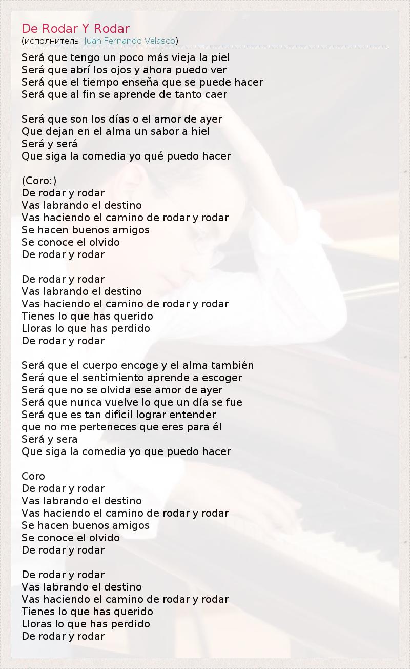 Será que tengo un poco más vieja la piel Será que abrí los ojos y ahora puedo ver Será que el tiempo enseña que se puede hacer Será que al fin se aprende de tanto caer Será que son los días o el amor de ayer Que dejan en el alma un sabor a hiel Será y será Que siga la comedia yo qué puedo hacer (Coro:) De rodar y rodar Vas labrando el destino Vas haciendo el camino de rodar y rodar Se hacen buenos amigos Se conoce el olvido De rodar y rodar De rodar y rodar Vas labrando el destino Vas haciendo el camino de rodar y rodar Tienes lo que has querido Lloras lo que has perdido De rodar y rodar Será que el cuerpo encoge y el alma también Será que el sentimiento aprende a escoger Será que no se olvida ese amor de ayer Será que nunca vuelve lo que un día se fue Será que es tan difícil lograr entender que no me perteneces que eres para él Será y sera Que siga la comedia yo que puedo hacer Coro De rodar y rodar Vas labrando el destino Vas haciendo el camino de rodar y rodar Se hacen buenos amigos Se conoce el olvido De rodar y rodar De rodar y rodar Vas labrando el destino Vas haciendo el camino de rodar y rodar Tienes lo que has querido Lloras lo que has perdido De rodar y rodar