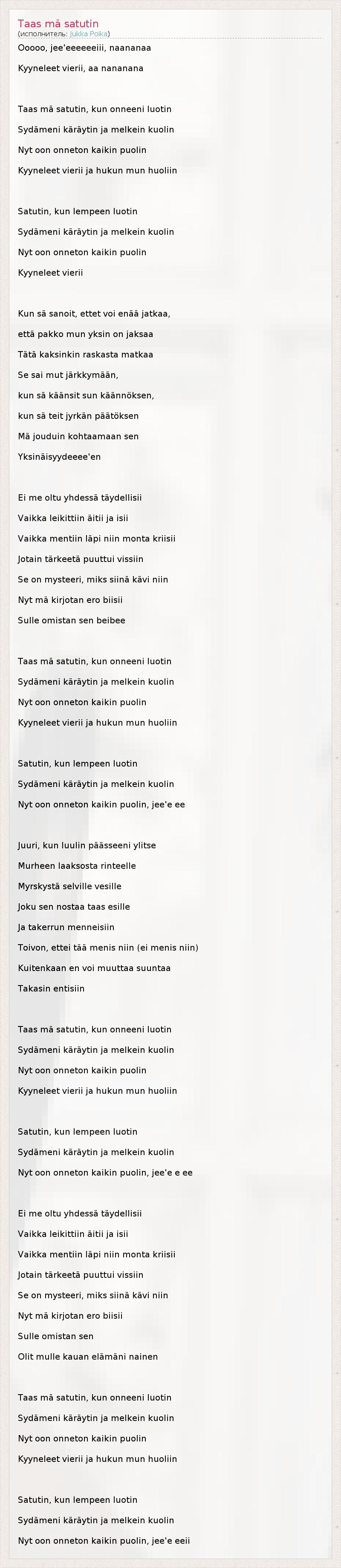 Ooooo, jee'eeeeeeiii, naananaa Kyyneleet vierii, aa nananana Taas mä satutin, kun onneeni luotin Sydämeni käräytin ja melkein kuolin Nyt oon onneton kaikin puolin Kyyneleet vierii ja hukun mun huoliin Satutin, kun lempeen luotin Sydämeni käräytin ja melkein kuolin Nyt oon onneton kaikin puolin Kyyneleet vierii Kun sä sanoit, ettet voi enää jatkaa, että pakko mun yksin on jaksaa Tätä kaksinkin raskasta matkaa Se sai mut järkkymään, kun sä käänsit sun käännöksen, kun sä teit jyrkän päätöksen Mä jouduin kohtaamaan sen Yksinäisyydeeee'en Ei me oltu yhdessä täydellisii Vaikka leikittiin äitii ja isii Vaikka mentiin läpi niin monta kriisii Jotain tärkeetä puuttui vissiin Se on mysteeri, miks siinä kävi niin Nyt mä kirjotan ero biisii Sulle omistan sen beibee Taas mä satutin, kun onneeni luotin Sydämeni käräytin ja melkein kuolin Nyt oon onneton kaikin puolin Kyyneleet vierii ja hukun mun huoliin Satutin, kun lempeen luotin Sydämeni käräytin ja melkein kuolin Nyt oon onneton kaikin puolin, jee'e ee Juuri, kun luulin päässeeni ylitse Murheen laaksosta rinteelle Myrskystä selville vesille Joku sen nostaa taas esille Ja takerrun menneisiin Toivon, ettei tää menis niin (ei menis niin) Kuitenkaan en voi muuttaa suuntaa Takasin entisiin Taas mä satutin, kun onneeni luotin Sydämeni käräytin ja melkein kuolin Nyt oon onneton kaikin puolin Kyyneleet vierii ja hukun mun huoliin Satutin, kun lempeen luotin Sydämeni käräytin ja melkein kuolin Nyt oon onneton kaikin puolin, jee'e e ee Ei me oltu yhdessä täydellisii Vaikka leikittiin äitii ja isii Vaikka mentiin läpi niin monta kriisii Jotain tärkeetä puuttui vissiin Se on mysteeri, miks siinä kävi niin Nyt mä kirjotan ero biisii Sulle omistan sen Olit mulle kauan elämäni nainen Taas mä satutin, kun onneeni luotin Sydämeni käräytin ja melkein kuolin Nyt oon onneton kaikin puolin Kyyneleet vierii ja hukun mun huoliin Satutin, kun lempeen luotin Sydämeni käräytin ja melkein kuolin Nyt oon onneton kaikin puolin, jee'e eeii