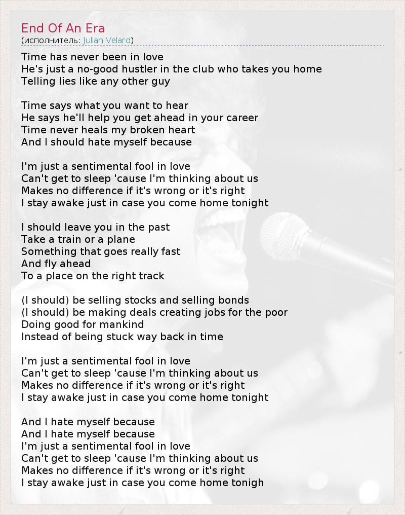 Время никогда не был влюблен Он просто никуда не годный карманник в клубе , который берет вас домой Лжи , как и любой другой парень Время говорит , что вы хотите услышать Он говорит, что поможет вам получить вперед в вашей карьере Время никогда не лечит мое разбитое сердце И я должен ненавидеть себя, потому что Я просто сентиментальный дурак в любви Не можете заснуть , потому что я думаю о нас Не имеет никакого значения, если это не так или это правильно Я бодрствовать на всякий случай вы приходите домой сегодня вечером Я должен оставить вас в прошлом Сядьте на поезд или самолет То, что идет очень быстро И летать вперед К месту на правильном пути (Я должен ) быть продажи акций и продажи облигаций (Я должен ) быть заключения сделок , создающих рабочие места для бедных Делая добро для человечества Вместо того, чтобы застрять путь назад во времени Я просто сентиментальный дурак в любви Не можете заснуть , потому что я думаю о нас Не имеет никакого значения, если это не так или это правильно Я бодрствовать на всякий случай вы приходите домой сегодня вечером И я ненавижу себя , потому что И я ненавижу себя , потому что Я просто сентиментальный дурак в любви Не можете заснуть , потому что я думаю о нас Не имеет никакого значения, если это не так или это правильно Я бодрствовать на всякий случай вы приходите домой Tonigh