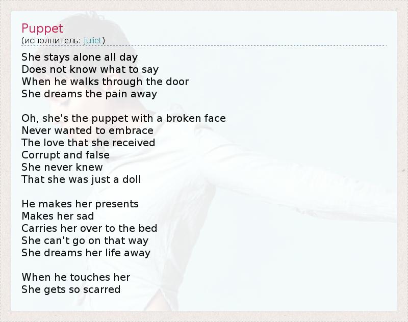 She stays alone all day Does not know what to say When he walks through the door She dreams the pain away Oh, she's the puppet with a broken face Never wanted to embrace The love that she received Corrupt and false She never knew That she was just a doll He makes her presents Makes her sad Carries her over to the bed She can't go on that way She dreams her life away When he touches her She gets so scarred