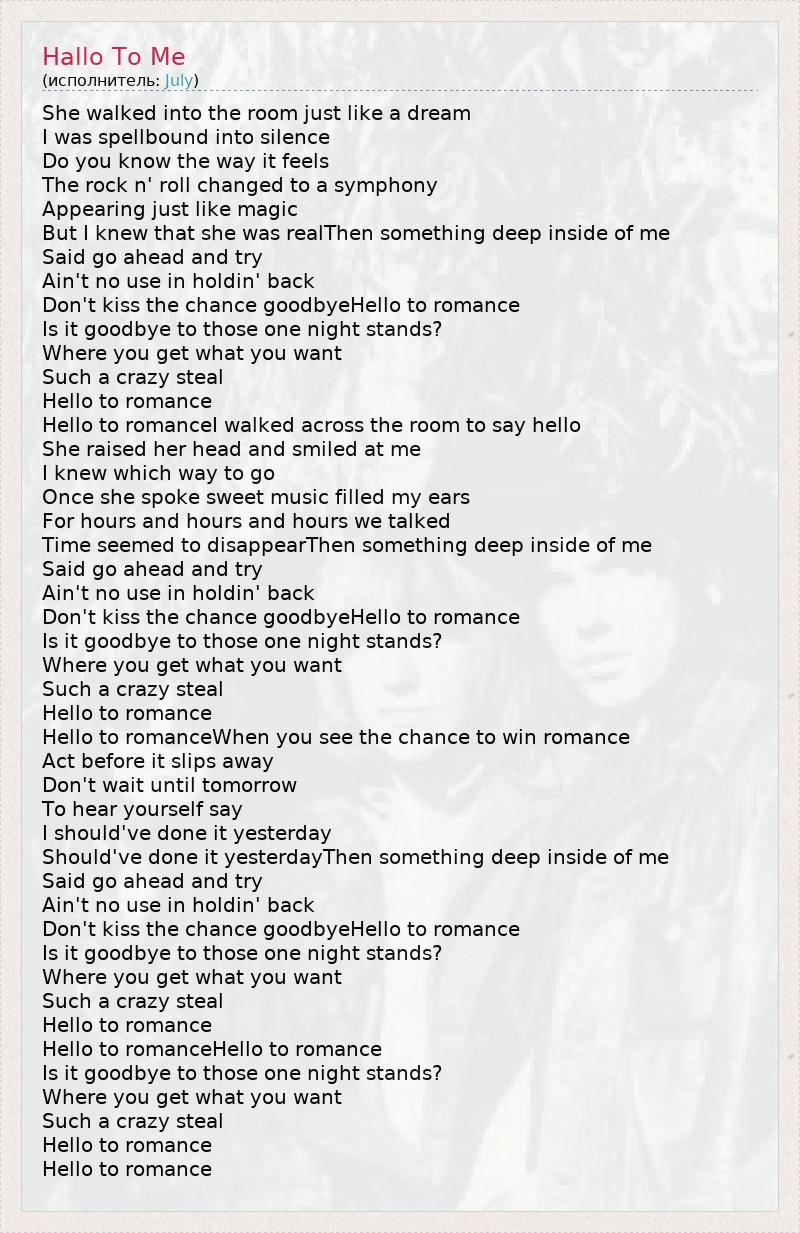 She walked into the room just like a dream I was spellbound into silence Do you know the way it feels The rock n' roll changed to a symphony Appearing just like magic But I knew that she was realThen something deep inside of me Said go ahead and try Ain't no use in holdin' back Don't kiss the chance goodbyeHello to romance Is it goodbye to those one night stands? Where you get what you want Such a crazy steal Hello to romance Hello to romanceI walked across the room to say hello She raised her head and smiled at me I knew which way to go Once she spoke sweet music filled my ears For hours and hours and hours we talked Time seemed to disappearThen something deep inside of me Said go ahead and try Ain't no use in holdin' back Don't kiss the chance goodbyeHello to romance Is it goodbye to those one night stands? Where you get what you want Such a crazy steal Hello to romance Hello to romanceWhen you see the chance to win romance Act before it slips away Don't wait until tomorrow To hear yourself say I should've done it yesterday Should've done it yesterdayThen something deep inside of me Said go ahead and try Ain't no use in holdin' back Don't kiss the chance goodbyeHello to romance Is it goodbye to those one night stands? Where you get what you want Such a crazy steal Hello to romance Hello to romanceHello to romance Is it goodbye to those one night stands? Where you get what you want Such a crazy steal Hello to romance Hello to romance