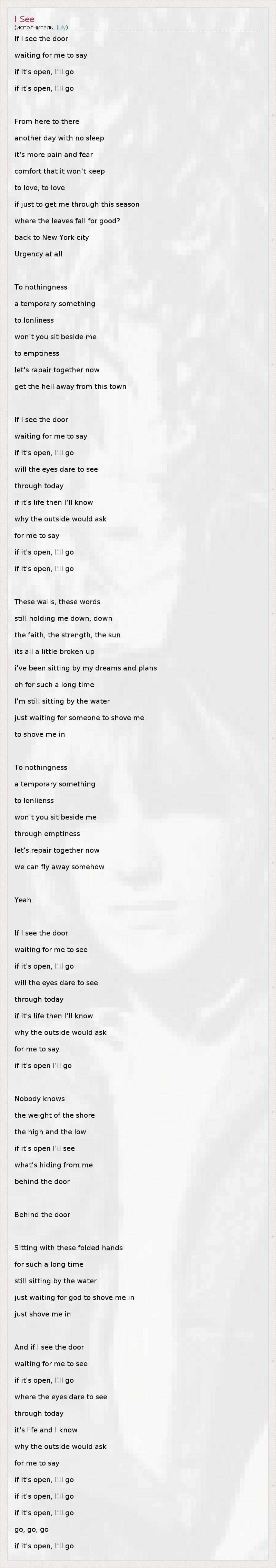 If I see the door waiting for me to say if it's open, I'll go if it's open, I'll go From here to there another day with no sleep it's more pain and fear comfort that it won't keep to love, to love if just to get me through this season where the leaves fall for good? back to New York city Urgency at all To nothingness a temporary something to lonliness won't you sit beside me to emptiness let's rapair together now get the hell away from this town If I see the door waiting for me to say if it's open, I'll go will the eyes dare to see through today if it's life then I'll know why the outside would ask for me to say if it's open, I'll go if it's open, I'll go These walls, these words still holding me down, down the faith, the strength, the sun its all a little broken up i've been sitting by my dreams and plans oh for such a long time I'm still sitting by the water just waiting for someone to shove me to shove me in To nothingness a temporary something to lonlienss won't you sit beside me through emptiness let's repair together now we can fly away somehow Yeah If I see the door waiting for me to see if it's open, I'll go will the eyes dare to see through today if it's life then I'll know why the outside would ask for me to say if it's open I'll go Nobody knows the weight of the shore the high and the low if it's open I'll see what's hiding from me behind the door Behind the door Sitting with these folded hands for such a long time still sitting by the water just waiting for god to shove me in just shove me in And if I see the door waiting for me to see if it's open, I'll go where the eyes dare to see through today it's life and I know why the outside would ask for me to say if it's open, I'll go if it's open, I'll go if it's open, I'll go go, go, go if it's open, I'll go