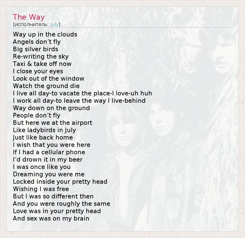Way up in the clouds Angels don’t fly Big silver birds Re-writing the sky Taxi & take off now I close your eyes Look out of the window Watch the ground die I live all day-to vacate the place-I love-uh huh I work all day-to leave the way I live-behind Way down on the ground People don’t fly But here we at the airport Like ladybirds in July Just like back home I wish that you were here If I had a cellular phone I’d drown it in my beer I was once like you Dreaming you were me Locked inside your pretty head Wishing I was free But I was so different then And you were roughly the same Love was in your pretty head And sex was on my brain