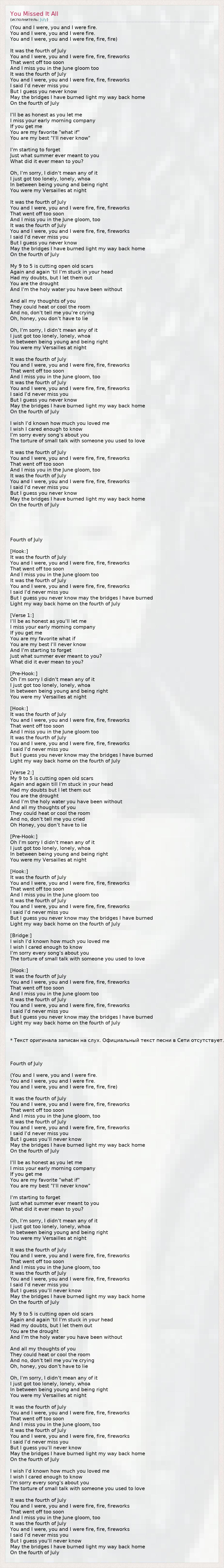 А как ты думаешь, о чем песня "You Missed It All" ?