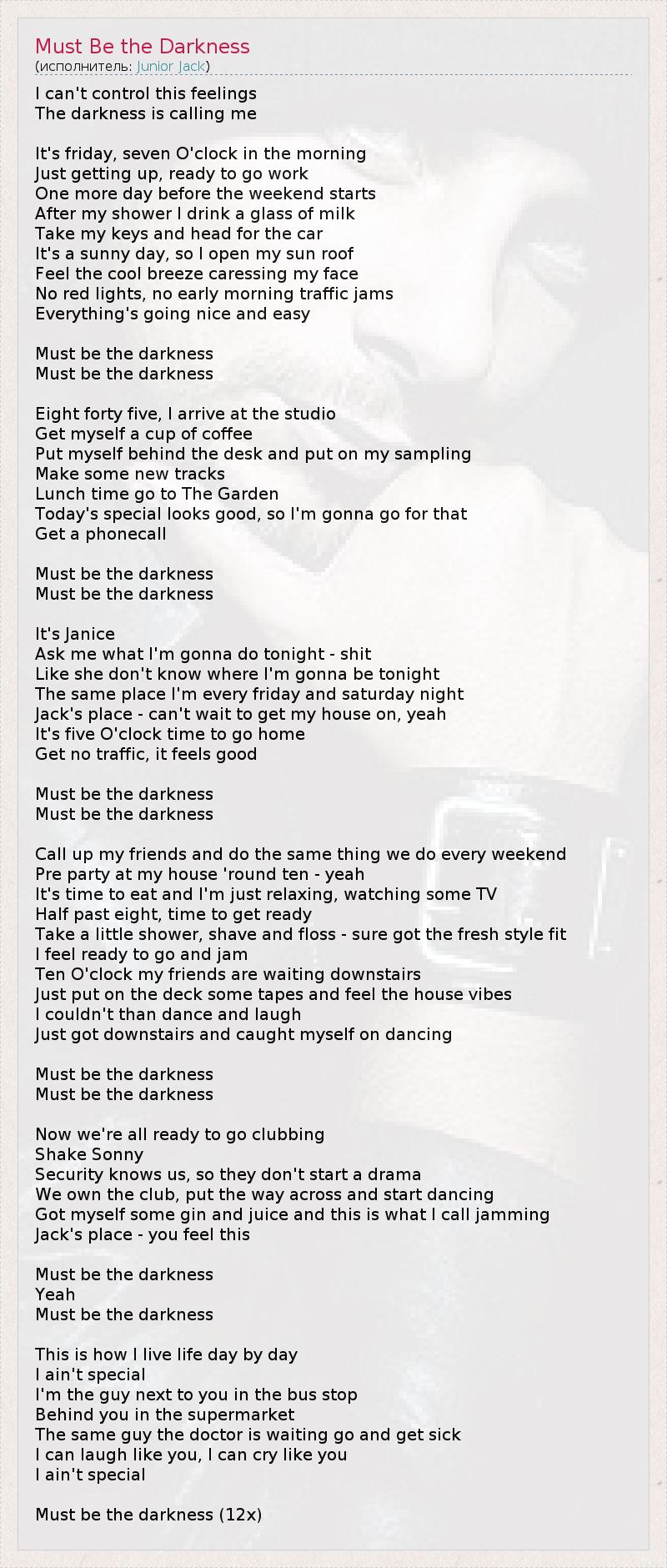 I can't control this feelings The darkness is calling me It's friday, seven O'clock in the morning Just getting up, ready to go work One more day before the weekend starts After my shower I drink a glass of milk Take my keys and head for the car It's a sunny day, so I open my sun roof Feel the cool breeze caressing my face No red lights, no early morning traffic jams Everything's going nice and easy Must be the darkness Must be the darkness Eight forty five, I arrive at the studio Get myself a cup of coffee Put myself behind the desk and put on my sampling Make some new tracks Lunch time go to The Garden Today's special looks good, so I'm gonna go for that Get a phonecall Must be the darkness Must be the darkness It's Janice Ask me what I'm gonna do tonight - shit Like she don't know where I'm gonna be tonight The same place I'm every friday and saturday night Jack's place - can't wait to get my house on, yeah It's five O'clock time to go home Get no traffic, it feels good Must be the darkness Must be the darkness Call up my friends and do the same thing we do every weekend Pre party at my house 'round ten - yeah It's time to eat and I'm just relaxing, watching some TV Half past eight, time to get ready Take a little shower, shave and floss - sure got the fresh style fit I feel ready to go and jam Ten O'clock my friends are waiting downstairs Just put on the deck some tapes and feel the house vibes I couldn't than dance and laugh Just got downstairs and caught myself on dancing Must be the darkness Must be the darkness Now we're all ready to go clubbing Shake Sonny Security knows us, so they don't start a drama We own the club, put the way across and start dancing Got myself some gin and juice and this is what I call jamming Jack's place - you feel this Must be the darkness Yeah Must be the darkness This is how I live life day by day I ain't special I'm the guy next to you in the bus stop Behind you in the supermarket The same guy the doctor is waiting go and get sick I can laugh like you, I can cry like you I ain't special Must be the darkness (12x)