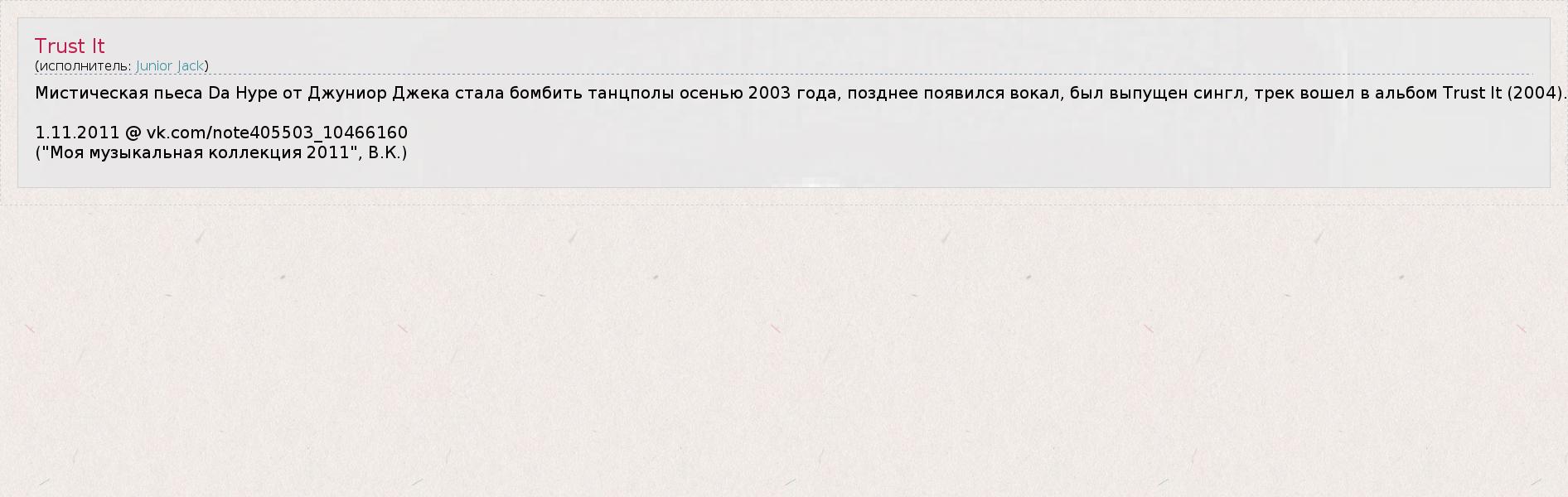 Мистическая пьеса Da Hype от Джуниор Джека стала бомбить танцполы осенью 2003 года, позднее появился вокал, был выпущен сингл, трек вошел в альбом Trust It (2004).