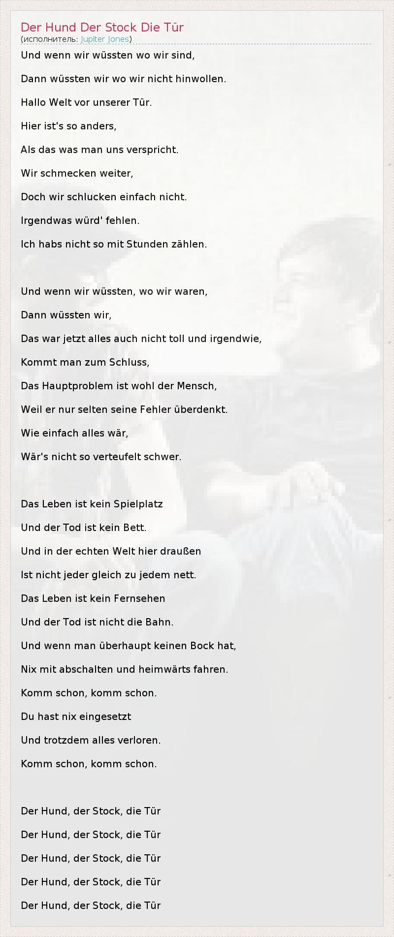 Und wenn wir wüssten wo wir sind, Dann wüssten wir wo wir nicht hinwollen. Hallo Welt vor unserer Tür. Hier ist's so anders, Als das was man uns verspricht. Wir schmecken weiter, Doch wir schlucken einfach nicht. Irgendwas würd' fehlen. Ich habs nicht so mit Stunden zählen. Und wenn wir wüssten, wo wir waren, Dann wüssten wir, Das war jetzt alles auch nicht toll und irgendwie, Kommt man zum Schluss, Das Hauptproblem ist wohl der Mensch, Weil er nur selten seine Fehler überdenkt. Wie einfach alles wär, Wär's nicht so verteufelt schwer. Das Leben ist kein Spielplatz Und der Tod ist kein Bett. Und in der echten Welt hier draußen Ist nicht jeder gleich zu jedem nett. Das Leben ist kein Fernsehen Und der Tod ist nicht die Bahn. Und wenn man überhaupt keinen Bock hat, Nix mit abschalten und heimwärts fahren. Komm schon, komm schon. Du hast nix eingesetzt Und trotzdem alles verloren. Komm schon, komm schon. Der Hund, der Stock, die Tür Der Hund, der Stock, die Tür Der Hund, der Stock, die Tür Der Hund, der Stock, die Tür Der Hund, der Stock, die Tür