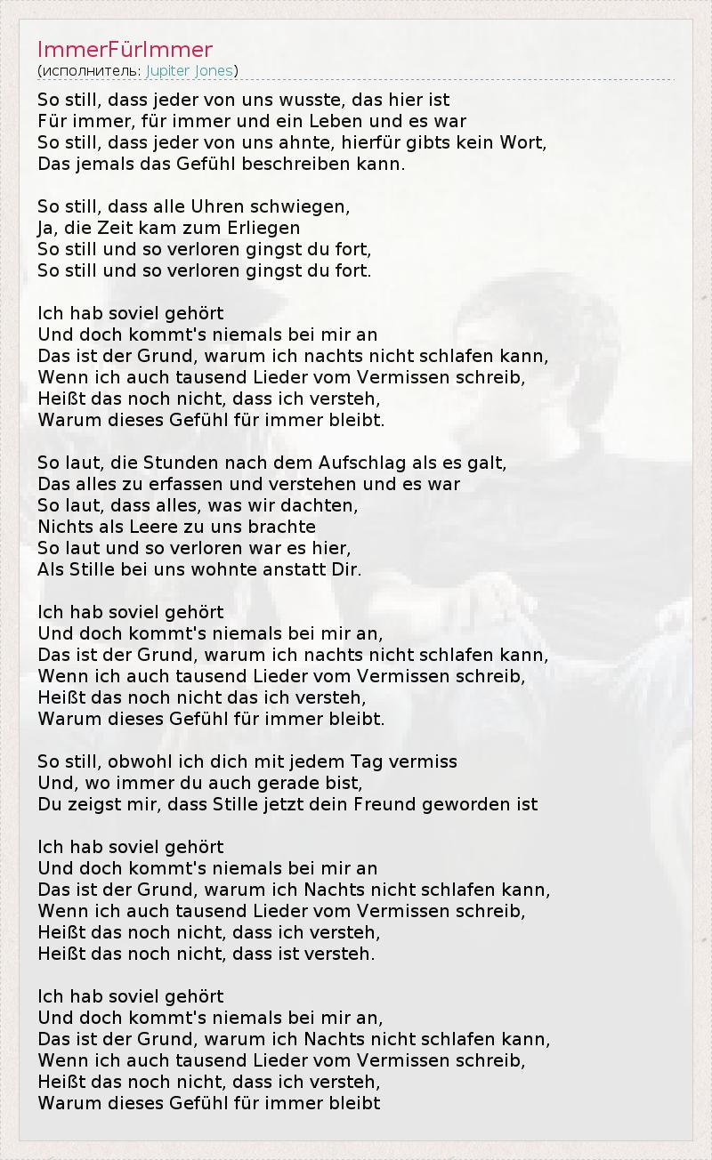 So still, dass jeder von uns wusste, das hier ist Für immer, für immer und ein Leben und es war So still, dass jeder von uns ahnte, hierfür gibts kein Wort, Das jemals das Gefühl beschreiben kann. So still, dass alle Uhren schwiegen, Ja, die Zeit kam zum Erliegen So still und so verloren gingst du fort, So still und so verloren gingst du fort. Ich hab soviel gehört Und doch kommt's niemals bei mir an Das ist der Grund, warum ich nachts nicht schlafen kann, Wenn ich auch tausend Lieder vom Vermissen schreib, Heißt das noch nicht, dass ich versteh, Warum dieses Gefühl für immer bleibt. So laut, die Stunden nach dem Aufschlag als es galt, Das alles zu erfassen und verstehen und es war So laut, dass alles, was wir dachten, Nichts als Leere zu uns brachte So laut und so verloren war es hier, Als Stille bei uns wohnte anstatt Dir. Ich hab soviel gehört Und doch kommt's niemals bei mir an, Das ist der Grund, warum ich nachts nicht schlafen kann, Wenn ich auch tausend Lieder vom Vermissen schreib, Heißt das noch nicht das ich versteh, Warum dieses Gefühl für immer bleibt. So still, obwohl ich dich mit jedem Tag vermiss Und, wo immer du auch gerade bist, Du zeigst mir, dass Stille jetzt dein Freund geworden ist Ich hab soviel gehört Und doch kommt's niemals bei mir an Das ist der Grund, warum ich Nachts nicht schlafen kann, Wenn ich auch tausend Lieder vom Vermissen schreib, Heißt das noch nicht, dass ich versteh, Heißt das noch nicht, dass ist versteh. Ich hab soviel gehört Und doch kommt's niemals bei mir an, Das ist der Grund, warum ich Nachts nicht schlafen kann, Wenn ich auch tausend Lieder vom Vermissen schreib, Heißt das noch nicht, dass ich versteh, Warum dieses Gefühl für immer bleibt