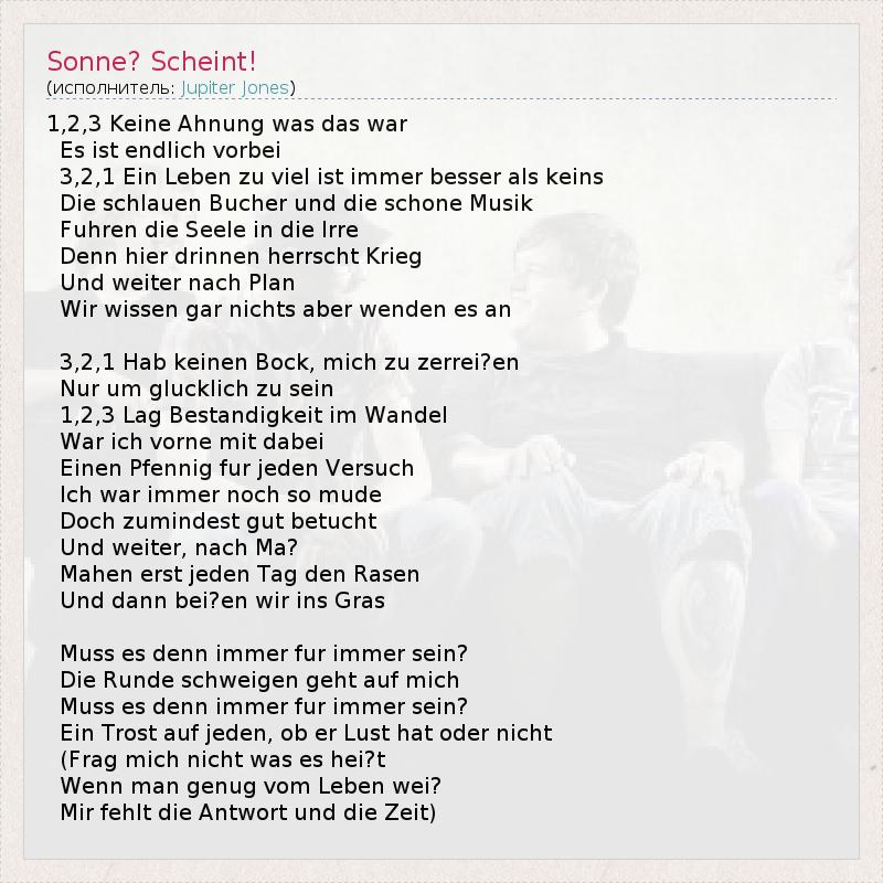 1,2,3 Keine Ahnung was das war Es ist endlich vorbei 3,2,1 Ein Leben zu viel ist immer besser als keins Die schlauen Bucher und die schone Musik Fuhren die Seele in die Irre Denn hier drinnen herrscht Krieg Und weiter nach Plan Wir wissen gar nichts aber wenden es an 3,2,1 Hab keinen Bock, mich zu zerrei?en Nur um glucklich zu sein 1,2,3 Lag Bestandigkeit im Wandel War ich vorne mit dabei Einen Pfennig fur jeden Versuch Ich war immer noch so mude Doch zumindest gut betucht Und weiter, nach Ma? Mahen erst jeden Tag den Rasen Und dann bei?en wir ins Gras Muss es denn immer fur immer sein? Die Runde schweigen geht auf mich Muss es denn immer fur immer sein? Ein Trost auf jeden, ob er Lust hat oder nicht (Frag mich nicht was es hei?t Wenn man genug vom Leben wei? Mir fehlt die Antwort und die Zeit)