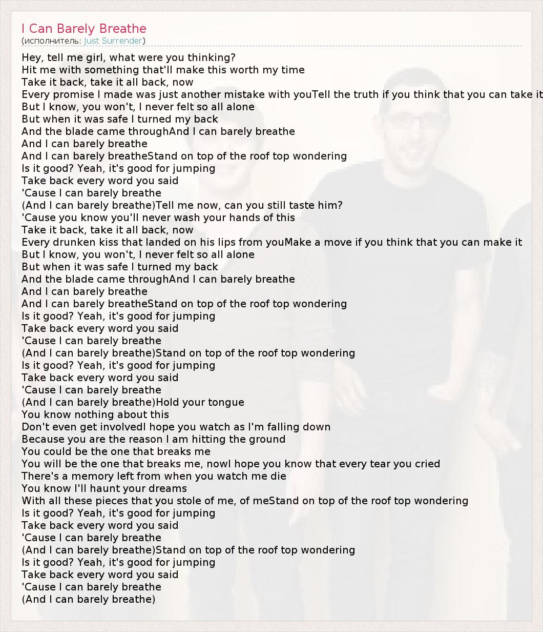 Hey, tell me girl, what were you thinking? Hit me with something that'll make this worth my time Take it back, take it all back, now Every promise I made was just another mistake with youTell the truth if you think that you can take it But I know, you won't, I never felt so all alone But when it was safe I turned my back And the blade came throughAnd I can barely breathe And I can barely breathe And I can barely breatheStand on top of the roof top wondering Is it good? Yeah, it's good for jumping Take back every word you said 'Cause I can barely breathe (And I can barely breathe)Tell me now, can you still taste him? 'Cause you know you'll never wash your hands of this Take it back, take it all back, now Every drunken kiss that landed on his lips from youMake a move if you think that you can make it But I know, you won't, I never felt so all alone But when it was safe I turned my back And the blade came throughAnd I can barely breathe And I can barely breathe And I can barely breatheStand on top of the roof top wondering Is it good? Yeah, it's good for jumping Take back every word you said 'Cause I can barely breathe (And I can barely breathe)Stand on top of the roof top wondering Is it good? Yeah, it's good for jumping Take back every word you said 'Cause I can barely breathe (And I can barely breathe)Hold your tongue You know nothing about this Don't even get involvedI hope you watch as I'm falling down Because you are the reason I am hitting the ground You could be the one that breaks me You will be the one that breaks me, nowI hope you know that every tear you cried There's a memory left from when you watch me die You know I'll haunt your dreams With all these pieces that you stole of me, of meStand on top of the roof top wondering Is it good? Yeah, it's good for jumping Take back every word you said 'Cause I can barely breathe (And I can barely breathe)Stand on top of the roof top wondering Is it good? Yeah, it's good for jumping Take back every word you said 'Cause I can barely breathe (And I can barely breathe)