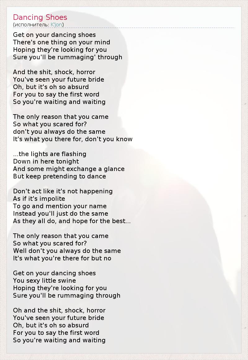 Надень свои танцевальные туфли! Ты можешь думать только об одном. Ты надеешься, что тебя ищут, Конечно, ты тоже будешь искать. Ой черт! шок! ужас! Ты увидел свою будущую невесту! Но это же полный идиотизм для тебя - Сказать первое слово. И ты ждешь и ждешь... Это единственная причина, по которой ты пришел. Так чего же ты боишься? Ты же всегда так делаешь! Ты здесь для этого, неужели ты не знаешь? ...сегодня здесь Горят огни И люди обмениваются взглядами, Но делают вид, что танцуют Не веди себя так, будто ничего не происходит! Будто это неприлично: Подойти и представиться. Вместо этого ты делаешь то же, что и все, И надеешься на лучшее. Это единственная причина, по которой ты пришел. Так чего же ты боишься? Ты же всегда так делаешь! Ты здесь для этого, но нет!.. Надевай свои танцевальные туфли, Маленький сексуальный поросенок! Ты надеешься, что тебя ищут, Конечно, ты тоже будешь искать. Ой черт! шок! ужас! Ты увидел свою будущую невесту! Но это же полный идиотизм для тебя - Сказать первое слово. И ты ждешь и ждешь...