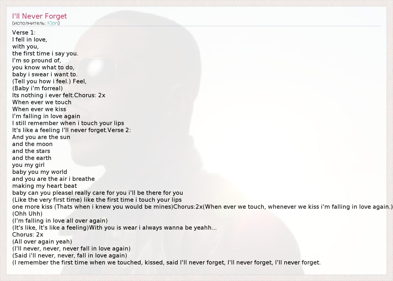 Verse 1: I fell in love, with you, the first time i say you. I'm so pround of, you know what to do, baby i swear i want to. (Tell you how i feel.) Feel, (Baby i'm forreal) Its nothing i ever felt.Chorus: 2x When ever we touch When ever we kiss I'm falling in love again I still remember when i touch your lips It's like a feeling I'll never forget.Verse 2: And you are the sun and the moon and the stars and the earth you my girl baby you my world and you are the air i breathe making my heart beat baby can you pleaseI really care for you i'll be there for you (Like the very first time) like the first time i touch your lips one more kiss (Thats when i knew you would be mines)Chorus:2x(When ever we touch, whenever we kiss i'm falling in love again.) (Ohh Uhh) (I'm falling in love all over again) (It's like, It's like a feeling)With you is wear i always wanna be yeahh... Chorus: 2x (All over again yeah) (I'll never, never, never fall in love again) (Said i'll never, never, fall in love again) (I remember the first time when we touched, kissed, said I'll never forget, I'll never forget, I'll never forget.