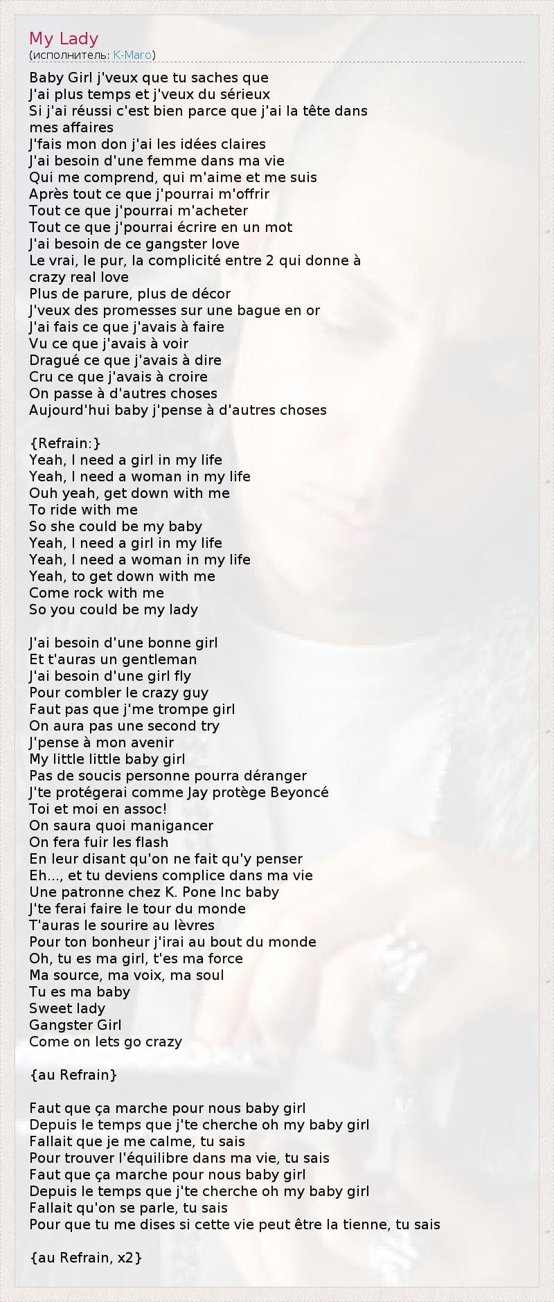 Детка моя Девочка, я хочу, чтобы ты знала, что У меня много времени и я хочу серьёзного Если я преуспею - это хорошо, потому что моя голова забита делами Использую свой талант, мои понятия чисты Мне нужна женщина в моей жизни Которая меня понимает, которая полюбит меня такого, После всего, что я смогу предложить Всё то, что я смогу купить Всё то, что я смогу написать в одном слове. Мне нужна та гангстерская любовь Истинная, чистая, полная между 2, которая выдаёт настоящую, сумасшедшую любовь Больше украшения, больше оформления Я хочу после обещаний о золотом кольце Я делаю то, что должен делать Учитывая то, что должен увидеть Усиливая то, что я должен сказать Верю в то, во что должен верить Проходя с другими вещами Сегодня, детка, я думаю по другому. Мне нужна женщина в моей жизни Чтобы быть со мной Поехать со мной Итак, она могла быть моей деткой. Мне нужна девушка в моей жизни Мне нужна женщина в моей жизни Чтобы быть со мной Идти стойко со мной Итак, ты могла бы быть моей деткой. Мне нужна одна хорошая девочка А тебе джентльмен Мне нужна одна девушка Для союза с без башенным парнем Не нужно ошибаться, девочка У нас не будет второй попытки Я думаю о своём будущем Моя маленькая, маленькая девочка Никакие заботы не будут беспокоить Я тебя защищу, как Jay защищает Beyonce Ты и я едины! Знаем что очевидно Сменим кадр Говорим, что только и делаем, что тут думать Эх...,и ты станешь частью моей жизни Владелец Kpone Inc., детка, Я сделаю тебе тур по миру На твоих губах будет улыбка Ради твоего счастья я пойду на край света О, ты моя девушка, ты моя сила, Мой источник, мой голос, моя душа Ты моя детка Сладкая леди Девушка гангстера Приходи , оторвёмся. Следовательно, это ради нас , девочка Со времени, что я тебя разыскиваю, О, моя девочка Надо было, чтобы я успокоился, ты знаешь Чтобы найти равновесие в моей жизни, ты знаешь Следовательно, это ради нас, девочка Со времени, что я тебя разыскиваю, О, моя девочка Надо было, чтобы говорили себе, ты знаешь И что ты мне скажешь, если эта жизнь может быть твоей, ты знаешь.