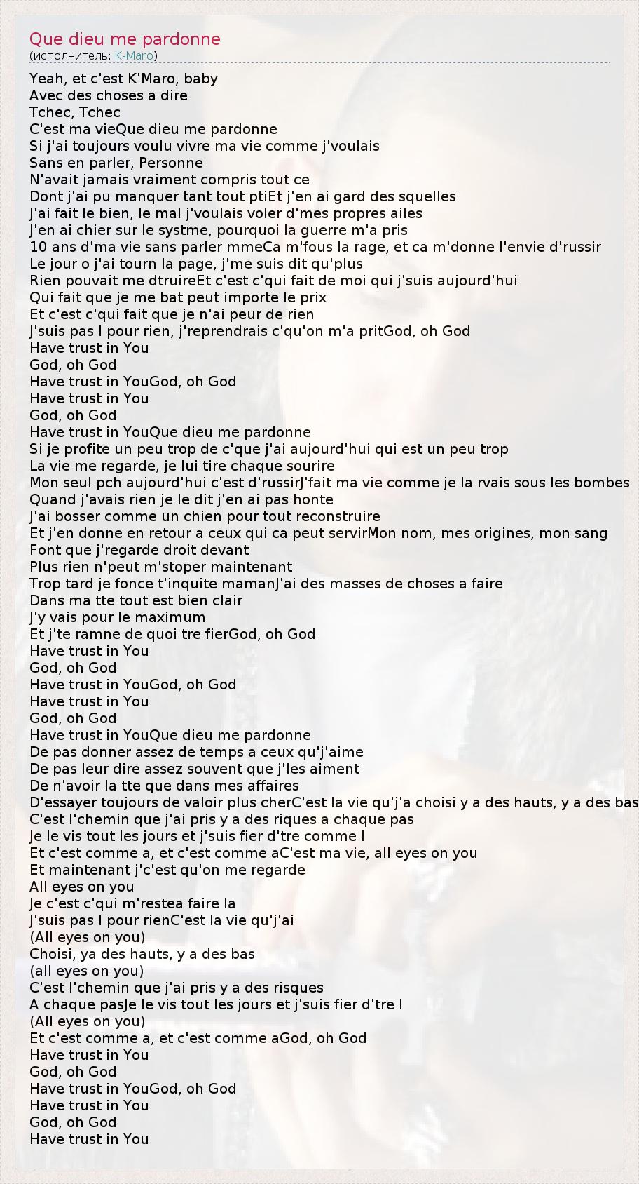 Yeah, et c'est K'Maro, baby Avec des choses a dire Tchec, Tchec C'est ma vieQue dieu me pardonne Si j'ai toujours voulu vivre ma vie comme j'voulais Sans en parler, Personne N'avait jamais vraiment compris tout ce Dont j'ai pu manquer tant tout ptiEt j'en ai gard des squelles J'ai fait le bien, le mal j'voulais voler d'mes propres ailes J'en ai chier sur le systme, pourquoi la guerre m'a pris 10 ans d'ma vie sans parler mmeCa m'fous la rage, et ca m'donne l'envie d'russir Le jour o j'ai tourn la page, j'me suis dit qu'plus Rien pouvait me dtruireEt c'est c'qui fait de moi qui j'suis aujourd'hui Qui fait que je me bat peut importe le prix Et c'est c'qui fait que je n'ai peur de rien J'suis pas l pour rien, j'reprendrais c'qu'on m'a pritGod, oh God Have trust in You God, oh God Have trust in YouGod, oh God Have trust in You God, oh God Have trust in YouQue dieu me pardonne Si je profite un peu trop de c'que j'ai aujourd'hui qui est un peu trop La vie me regarde, je lui tire chaque sourire Mon seul pch aujourd'hui c'est d'russirJ'fait ma vie comme je la rvais sous les bombes Quand j'avais rien je le dit j'en ai pas honte J'ai bosser comme un chien pour tout reconstruire Et j'en donne en retour a ceux qui ca peut servirMon nom, mes origines, mon sang Font que j'regarde droit devant Plus rien n'peut m'stoper maintenant Trop tard je fonce t'inquite mamanJ'ai des masses de choses a faire Dans ma tte tout est bien clair J'y vais pour le maximum Et j'te ramne de quoi tre fierGod, oh God Have trust in You God, oh God Have trust in YouGod, oh God Have trust in You God, oh God Have trust in YouQue dieu me pardonne De pas donner assez de temps a ceux qu'j'aime De pas leur dire assez souvent que j'les aiment De n'avoir la tte que dans mes affaires D'essayer toujours de valoir plus cherC'est la vie qu'j'a choisi y a des hauts, y a des bas C'est l'chemin que j'ai pris y a des riques a chaque pas Je le vis tout les jours et j'suis fier d'tre comme l Et c'est comme a, et c'est comme aC'est ma vie, all eyes on you Et maintenant j'c'est qu'on me regarde All eyes on you Je c'est c'qui m'restea faire la J'suis pas l pour rienC'est la vie qu'j'ai (All eyes on you) Choisi, ya des hauts, y a des bas (all eyes on you) C'est l'chemin que j'ai pris y a des risques A chaque pasJe le vis tout les jours et j'suis fier d'tre l (All eyes on you) Et c'est comme a, et c'est comme aGod, oh God Have trust in You God, oh God Have trust in YouGod, oh God Have trust in You God, oh God Have trust in You