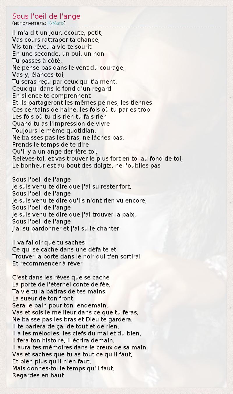 Il m'a dit un jour, écoute, petit, Vas cours rattraper ta chance, Vis ton rêve, la vie te sourit En une seconde, un oui, un non Tu passes à côté, Ne pense pas dans le vent du courage, Vas-y, élances-toi, Tu seras reçu par ceux qui t'aiment, Ceux qui dans le fond d'un regard En silence te comprennent Et ils partageront les mêmes peines, les tiennes Ces centains de haine, les fois où tu parles trop Les fois où tu dis rien tu fais rien Quand tu as l'impression de vivre Toujours le même quotidian, Ne baisses pas les bras, ne lâches pas, Prends le temps de te dire Qu'il y a un ange derrière toi, Relèves-toi, et vas trouver le plus fort en toi au fond de toi, Le bonheur est au bout des doigts, ne l'oublies pas Sous l'oeil de l'ange Je suis venu te dire que j'ai su rester fort, Sous l'oeil de l'ange Je suis venu te dire qu'ils n'ont rien vu encore, Sous l'oeil de l'ange Je suis venu te dire que j'ai trouver la paix, Sous l'oeil de l'ange J'ai su pardonner et j'ai su le chanter Il va falloir que tu saches Ce qui se cache dans une défaite et Trouver la porte dans le noir qui t'en sortirai Et recommencer à rêver C'est dans les rêves que se cache La porte de l'éternel conte de fée, Ta vie tu la bâtiras de tes mains, La sueur de ton front Sera le pain pour ton lendemain, Vas et sois le meilleur dans ce que tu feras, Ne baisse pas les bras et Dieu te gardera, Il te parlera de ça, de tout et de rien, Il a les mélodies, les clefs du mal et du bien, Il fera ton histoire, il écrira demain, Il aura tes mémoires dans le creux de sa main, Vas et saches que tu as tout ce qu'il faut, Et bien plus qu'il n'en faut, Mais donnes-toi le temps qu'il faut, Regardes en haut