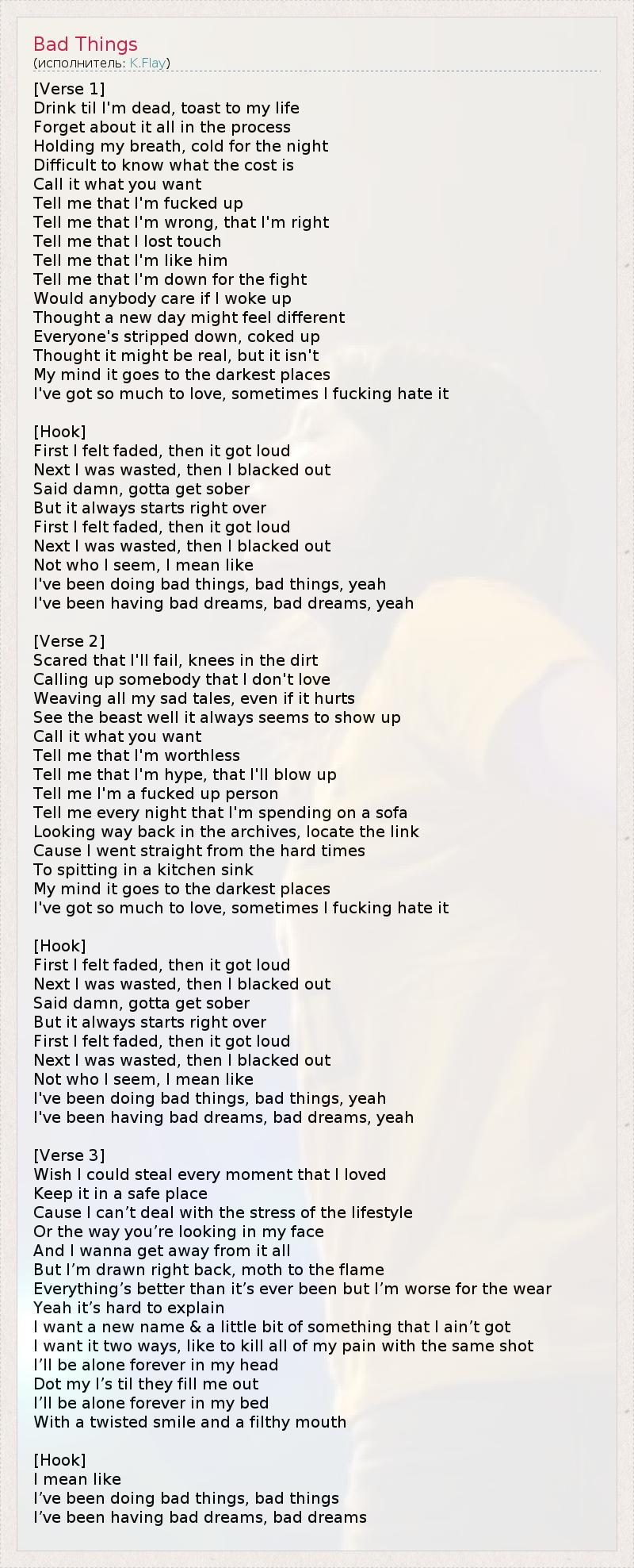 [Verse 1] Drink til I'm dead, toast to my life Forget about it all in the process Holding my breath, cold for the night Difficult to know what the cost is Call it what you want Tell me that I'm fucked up Tell me that I'm wrong, that I'm right Tell me that I lost touch Tell me that I'm like him Tell me that I'm down for the fight Would anybody care if I woke up Thought a new day might feel different Everyone's stripped down, coked up Thought it might be real, but it isn't My mind it goes to the darkest places I've got so much to love, sometimes I fucking hate it [Hook] First I felt faded, then it got loud Next I was wasted, then I blacked out Said damn, gotta get sober But it always starts right over First I felt faded, then it got loud Next I was wasted, then I blacked out Not who I seem, I mean like I've been doing bad things, bad things, yeah I've been having bad dreams, bad dreams, yeah [Verse 2] Scared that I'll fail, knees in the dirt Calling up somebody that I don't love Weaving all my sad tales, even if it hurts See the beast well it always seems to show up Call it what you want Tell me that I'm worthless Tell me that I'm hype, that I'll blow up Tell me I'm a fucked up person Tell me every night that I'm spending on a sofa Looking way back in the archives, locate the link Cause I went straight from the hard times To spitting in a kitchen sink My mind it goes to the darkest places I've got so much to love, sometimes I fucking hate it [Hook] First I felt faded, then it got loud Next I was wasted, then I blacked out Said damn, gotta get sober But it always starts right over First I felt faded, then it got loud Next I was wasted, then I blacked out Not who I seem, I mean like I've been doing bad things, bad things, yeah I've been having bad dreams, bad dreams, yeah [Verse 3] Wish I could steal every moment that I loved Keep it in a safe place Cause I can’t deal with the stress of the lifestyle Or the way you’re looking in my face And I wanna get away from it all But I’m drawn right back, moth to the flame Everything’s better than it’s ever been but I’m worse for the wear Yeah it’s hard to explain I want a new name & a little bit of something that I ain’t got I want it two ways, like to kill all of my pain with the same shot I’ll be alone forever in my head Dot my I’s til they fill me out I’ll be alone forever in my bed With a twisted smile and a filthy mouth [Hook] I mean like I’ve been doing bad things, bad things I’ve been having bad dreams, bad dreams