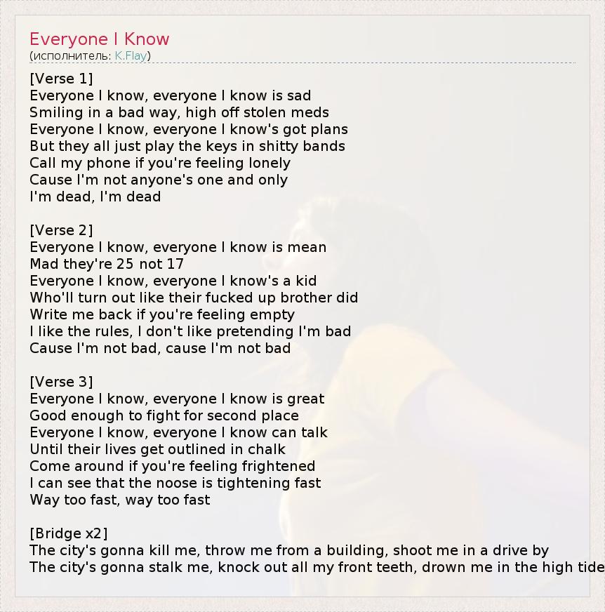 [Verse 1] Everyone I know, everyone I know is sad Smiling in a bad way, high off stolen meds Everyone I know, everyone I know's got plans But they all just play the keys in shitty bands Call my phone if you're feeling lonely Cause I'm not anyone's one and only I'm dead, I'm dead [Verse 2] Everyone I know, everyone I know is mean Mad they're 25 not 17 Everyone I know, everyone I know's a kid Who'll turn out like their fucked up brother did Write me back if you're feeling empty I like the rules, I don't like pretending I'm bad Cause I'm not bad, cause I'm not bad [Verse 3] Everyone I know, everyone I know is great Good enough to fight for second place Everyone I know, everyone I know can talk Until their lives get outlined in chalk Come around if you're feeling frightened I can see that the noose is tightening fast Way too fast, way too fast [Bridge x2] The city's gonna kill me, throw me from a building, shoot me in a drive by The city's gonna stalk me, knock out all my front teeth, drown me in the high tide