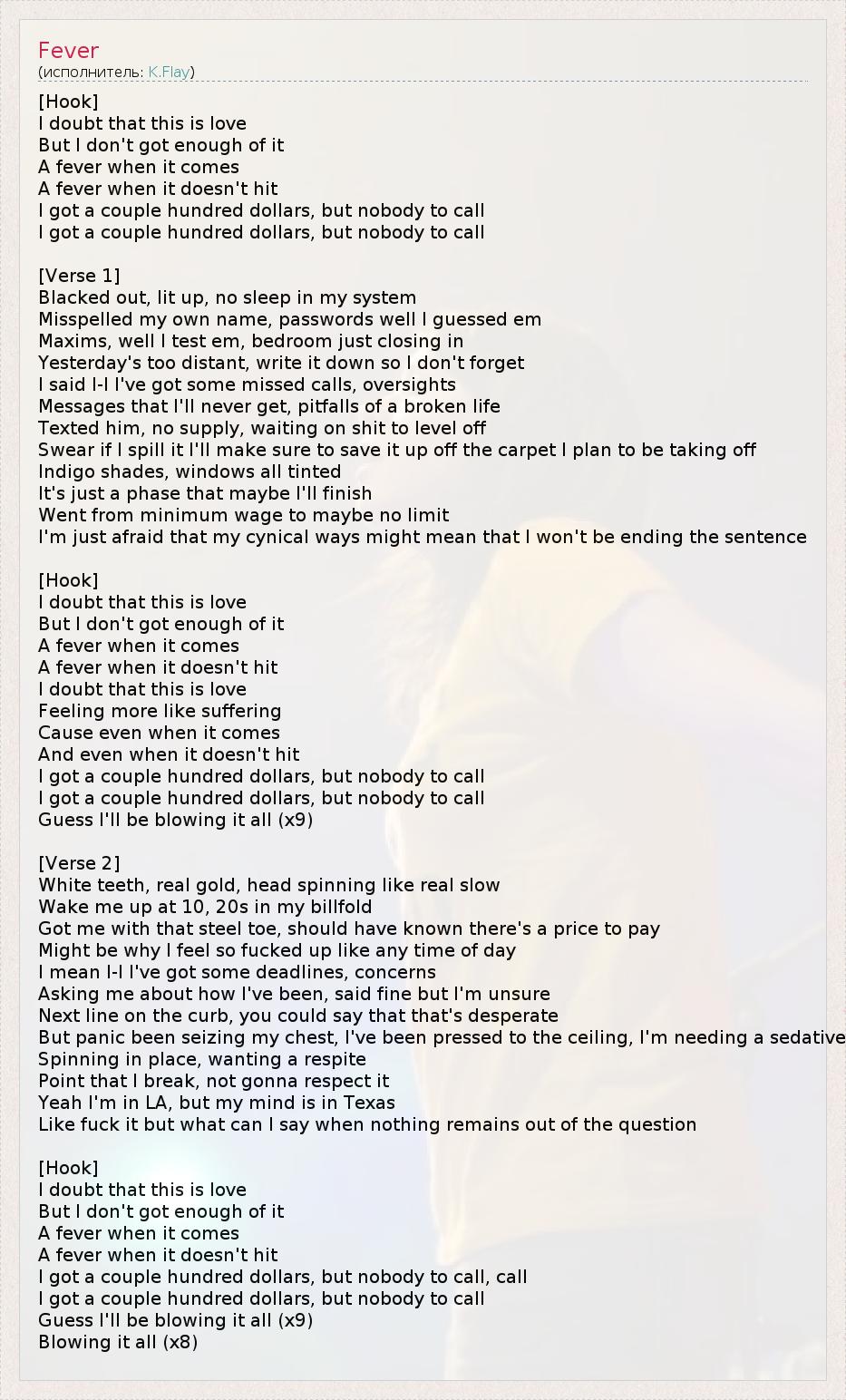 [Hook] I doubt that this is love But I don't got enough of it A fever when it comes A fever when it doesn't hit I got a couple hundred dollars, but nobody to call I got a couple hundred dollars, but nobody to call [Verse 1] Blacked out, lit up, no sleep in my system Misspelled my own name, passwords well I guessed em Maxims, well I test em, bedroom just closing in Yesterday's too distant, write it down so I don't forget I said I-I I've got some missed calls, oversights Messages that I'll never get, pitfalls of a broken life Texted him, no supply, waiting on shit to level off Swear if I spill it I'll make sure to save it up off the carpet I plan to be taking off Indigo shades, windows all tinted It's just a phase that maybe I'll finish Went from minimum wage to maybe no limit I'm just afraid that my cynical ways might mean that I won't be ending the sentence [Hook] I doubt that this is love But I don't got enough of it A fever when it comes A fever when it doesn't hit I doubt that this is love Feeling more like suffering Cause even when it comes And even when it doesn't hit I got a couple hundred dollars, but nobody to call I got a couple hundred dollars, but nobody to call Guess I'll be blowing it all (x9) [Verse 2] White teeth, real gold, head spinning like real slow Wake me up at 10, 20s in my billfold Got me with that steel toe, should have known there's a price to pay Might be why I feel so fucked up like any time of day I mean I-I I've got some deadlines, concerns Asking me about how I've been, said fine but I'm unsure Next line on the curb, you could say that that's desperate But panic been seizing my chest, I've been pressed to the ceiling, I'm needing a sedative Spinning in place, wanting a respite Point that I break, not gonna respect it Yeah I'm in LA, but my mind is in Texas Like fuck it but what can I say when nothing remains out of the question [Hook] I doubt that this is love But I don't got enough of it A fever when it comes A fever when it doesn't hit I got a couple hundred dollars, but nobody to call, call I got a couple hundred dollars, but nobody to call Guess I'll be blowing it all (x9) Blowing it all (x8)