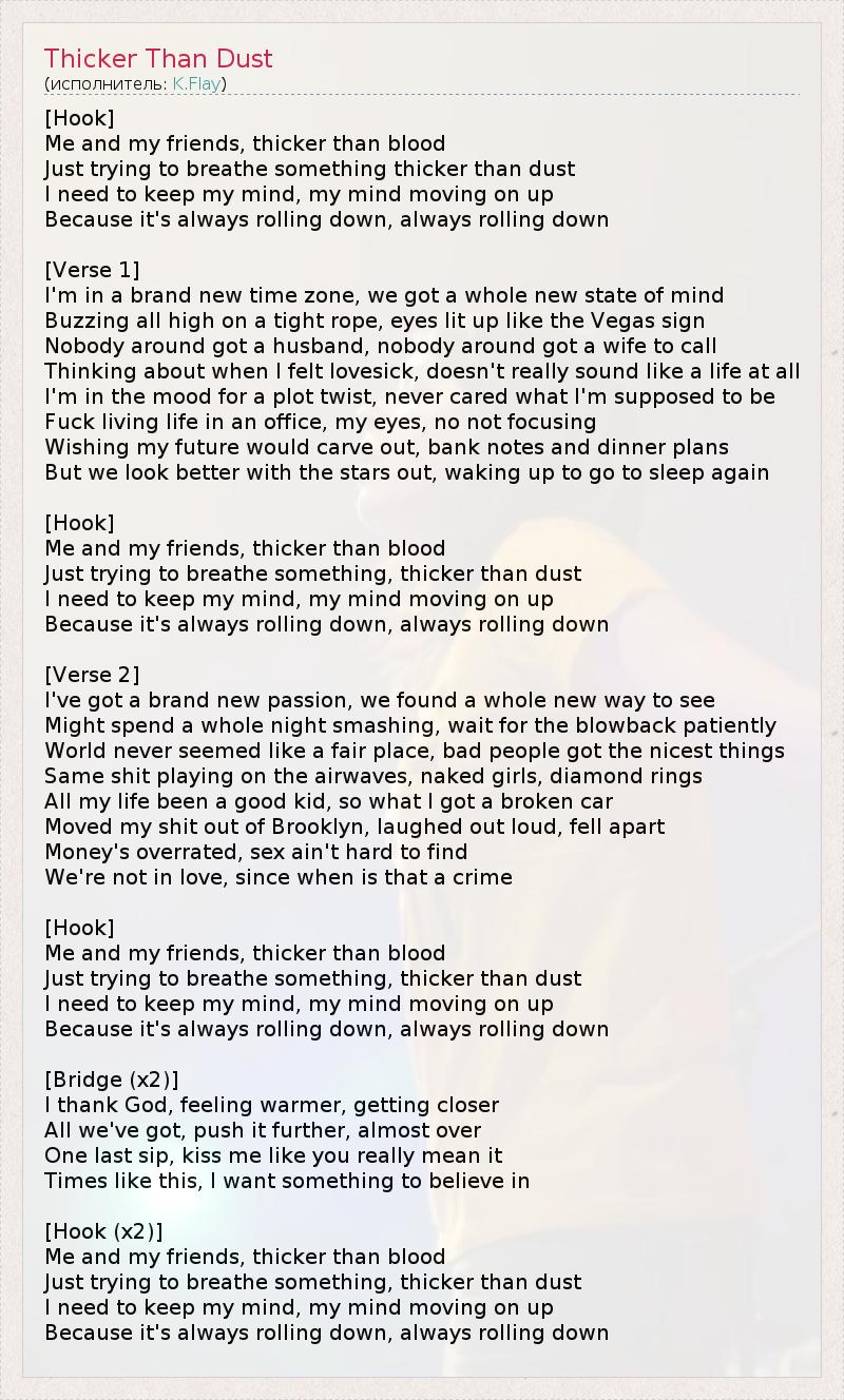 [Hook] Me and my friends, thicker than blood Just trying to breathe something thicker than dust I need to keep my mind, my mind moving on up Because it's always rolling down, always rolling down [Verse 1] I'm in a brand new time zone, we got a whole new state of mind Buzzing all high on a tight rope, eyes lit up like the Vegas sign Nobody around got a husband, nobody around got a wife to call Thinking about when I felt lovesick, doesn't really sound like a life at all I'm in the mood for a plot twist, never cared what I'm supposed to be Fuck living life in an office, my eyes, no not focusing Wishing my future would carve out, bank notes and dinner plans But we look better with the stars out, waking up to go to sleep again [Hook] Me and my friends, thicker than blood Just trying to breathe something, thicker than dust I need to keep my mind, my mind moving on up Because it's always rolling down, always rolling down [Verse 2] I've got a brand new passion, we found a whole new way to see Might spend a whole night smashing, wait for the blowback patiently World never seemed like a fair place, bad people got the nicest things Same shit playing on the airwaves, naked girls, diamond rings All my life been a good kid, so what I got a broken car Moved my shit out of Brooklyn, laughed out loud, fell apart Money's overrated, sex ain't hard to find We're not in love, since when is that a crime [Hook] Me and my friends, thicker than blood Just trying to breathe something, thicker than dust I need to keep my mind, my mind moving on up Because it's always rolling down, always rolling down [Bridge (x2)] I thank God, feeling warmer, getting closer All we've got, push it further, almost over One last sip, kiss me like you really mean it Times like this, I want something to believe in [Hook (x2)] Me and my friends, thicker than blood Just trying to breathe something, thicker than dust I need to keep my mind, my mind moving on up Because it's always rolling down, always rolling down
