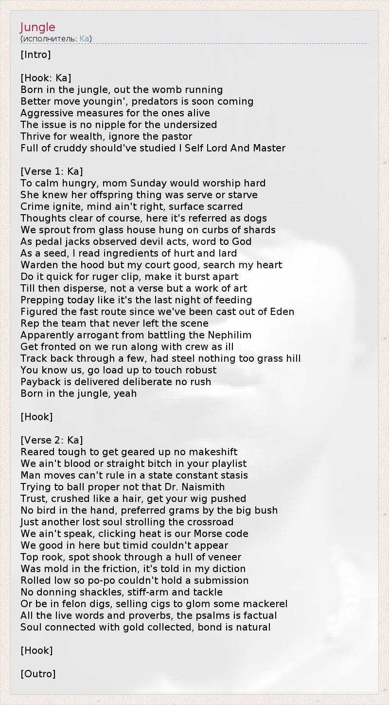 [Intro] [Hook: Ka] Born in the jungle, out the womb running Better move youngin', predators is soon coming Aggressive measures for the ones alive The issue is no nipple for the undersized Thrive for wealth, ignore the pastor Full of cruddy should've studied I Self Lord And Master [Verse 1: Ka] To calm hungry, mom Sunday would worship hard She knew her offspring thing was serve or starve Crime ignite, mind ain't right, surface scarred Thoughts clear of course, here it's referred as dogs We sprout from glass house hung on curbs of shards As pedal jacks observed devil acts, word to God As a seed, I read ingredients of hurt and lard Warden the hood but my court good, search my heart Do it quick for ruger clip, make it burst apart Till then disperse, not a verse but a work of art Prepping today like it's the last night of feeding Figured the fast route since we've been cast out of Eden Rep the team that never left the scene Apparently arrogant from battling the Nephilim Get fronted on we run along with crew as ill Track back through a few, had steel nothing too grass hill You know us, go load up to touch robust Payback is delivered deliberate no rush Born in the jungle, yeah [Hook] [Verse 2: Ka] Reared tough to get geared up no makeshift We ain't blood or straight bitch in your playlist Man moves can't rule in a state constant stasis Trying to ball proper not that Dr. Naismith Trust, crushed like a hair, get your wig pushed No bird in the hand, preferred grams by the big bush Just another lost soul strolling the crossroad We ain't speak, clicking heat is our Morse code We good in here but timid couldn't appear Top rook, spot shook through a hull of veneer Was mold in the friction, it's told in my diction Rolled low so po-po couldn't hold a submission No donning shackles, stiff-arm and tackle Or be in felon digs, selling cigs to glom some mackerel All the live words and proverbs, the psalms is factual Soul connected with gold collected, bond is natural [Hook] [Outro]