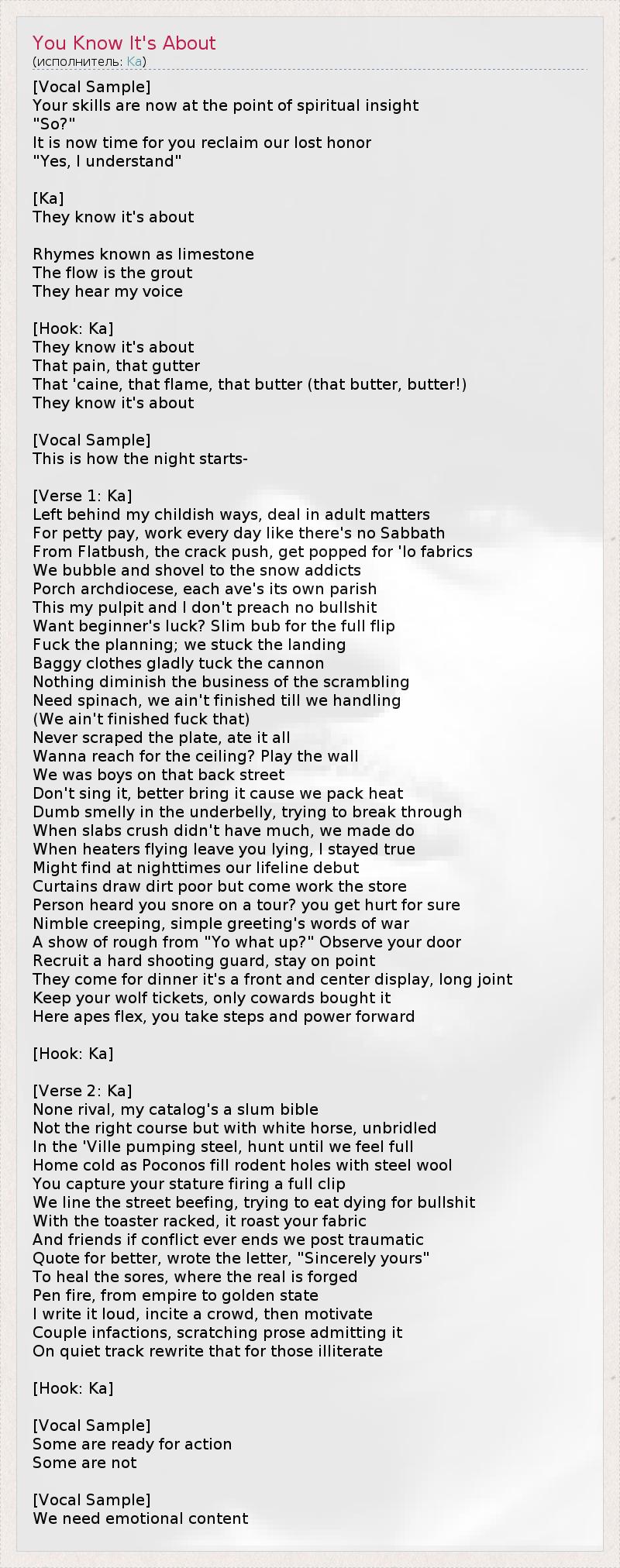 [Vocal Sample] Your skills are now at the point of spiritual insight "So?" It is now time for you reclaim our lost honor "Yes, I understand" [Ka] They know it's about Rhymes known as limestone The flow is the grout They hear my voice [Hook: Ka] They know it's about That pain, that gutter That 'caine, that flame, that butter (that butter, butter!) They know it's about [Vocal Sample] This is how the night starts- [Verse 1: Ka] Left behind my childish ways, deal in adult matters For petty pay, work every day like there's no Sabbath From Flatbush, the crack push, get popped for 'lo fabrics We bubble and shovel to the snow addicts Porch archdiocese, each ave's its own parish This my pulpit and I don't preach no bullshit Want beginner's luck? Slim bub for the full flip Fuck the planning; we stuck the landing Baggy clothes gladly tuck the cannon Nothing diminish the business of the scrambling Need spinach, we ain't finished till we handling (We ain't finished fuck that) Never scraped the plate, ate it all Wanna reach for the ceiling? Play the wall We was boys on that back street Don't sing it, better bring it cause we pack heat Dumb smelly in the underbelly, trying to break through When slabs crush didn't have much, we made do When heaters flying leave you lying, I stayed true Might find at nighttimes our lifeline debut Curtains draw dirt poor but come work the store Person heard you snore on a tour? you get hurt for sure Nimble creeping, simple greeting's words of war A show of rough from "Yo what up?" Observe your door Recruit a hard shooting guard, stay on point They come for dinner it's a front and center display, long joint Keep your wolf tickets, only cowards bought it Here apes flex, you take steps and power forward [Hook: Ka] [Verse 2: Ka] None rival, my catalog's a slum bible Not the right course but with white horse, unbridled In the 'Ville pumping steel, hunt until we feel full Home cold as Poconos fill rodent holes with steel wool You capture your stature firing a full clip We line the street beefing, trying to eat dying for bullshit With the toaster racked, it roast your fabric And friends if conflict ever ends we post traumatic Quote for better, wrote the letter, "Sincerely yours" To heal the sores, where the real is forged Pen fire, from empire to golden state I write it loud, incite a crowd, then motivate Couple infactions, scratching prose admitting it On quiet track rewrite that for those illiterate [Hook: Ka] [Vocal Sample] Some are ready for action Some are not [Vocal Sample] We need emotional content