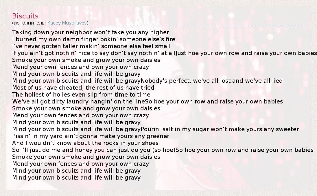 Mind your own biscuits and life will be gravyNobody's perfect, we've all lost and we've all lied