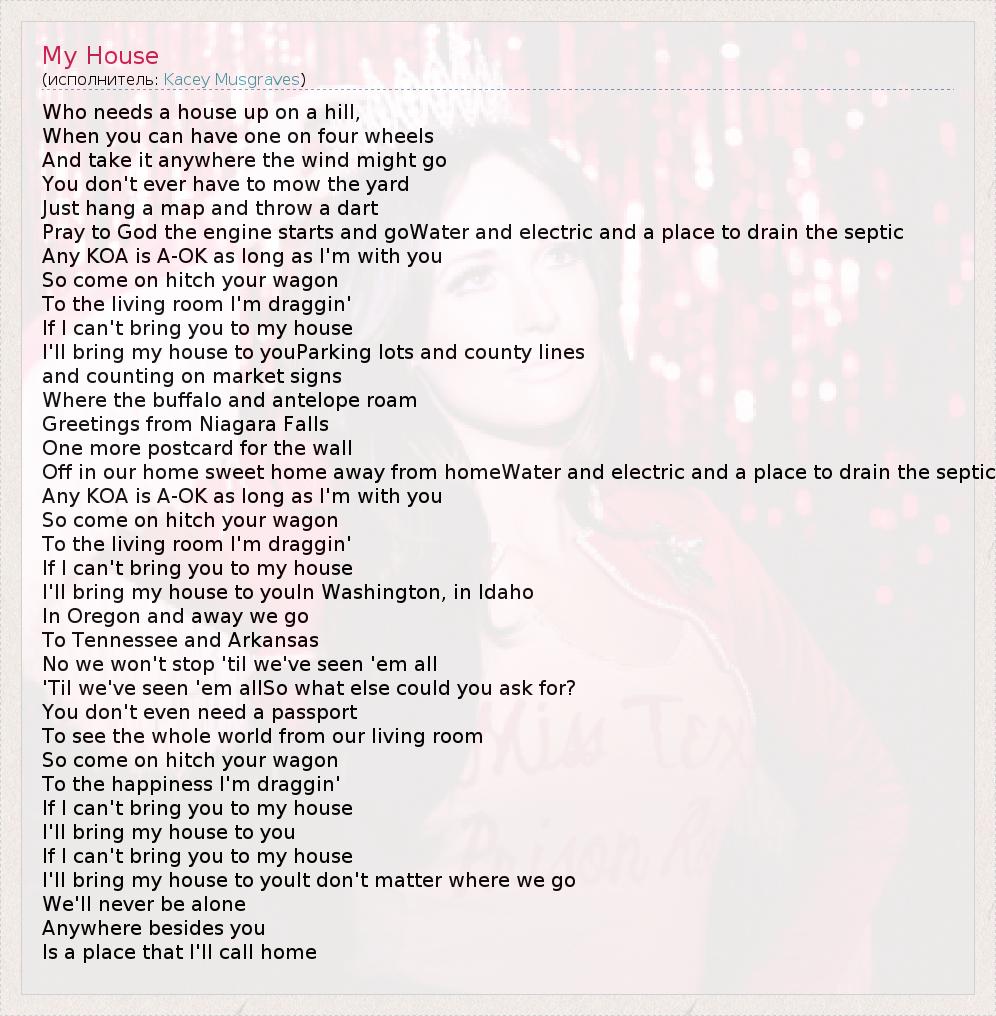 Who needs a house up on a hill, When you can have one on four wheels And take it anywhere the wind might go You don't ever have to mow the yard Just hang a map and throw a dart Pray to God the engine starts and goWater and electric and a place to drain the septic Any KOA is A-OK as long as I'm with you So come on hitch your wagon To the living room I'm draggin' If I can't bring you to my house I'll bring my house to youParking lots and county lines and counting on market signs Where the buffalo and antelope roam Greetings from Niagara Falls One more postcard for the wall Off in our home sweet home away from homeWater and electric and a place to drain the septic Any KOA is A-OK as long as I'm with you So come on hitch your wagon To the living room I'm draggin' If I can't bring you to my house I'll bring my house to youIn Washington, in Idaho In Oregon and away we go To Tennessee and Arkansas No we won't stop 'til we've seen 'em all 'Til we've seen 'em allSo what else could you ask for? You don't even need a passport To see the whole world from our living room So come on hitch your wagon To the happiness I'm draggin' If I can't bring you to my house I'll bring my house to you If I can't bring you to my house I'll bring my house to youIt don't matter where we go We'll never be alone Anywhere besides you Is a place that I'll call home