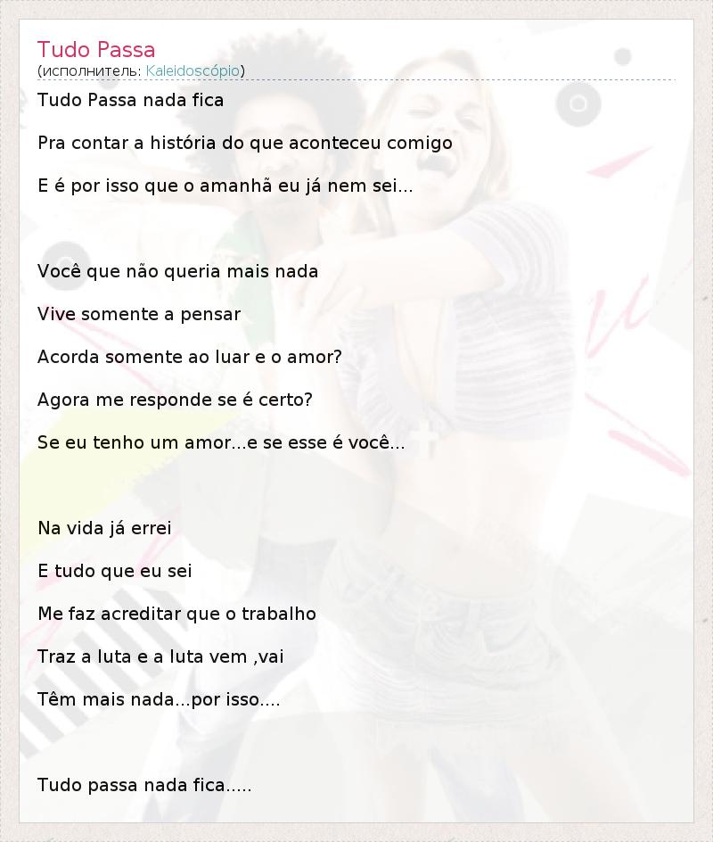 Tudo Passa nada fica Pra contar a história do que aconteceu comigo E é por isso que o amanhã eu já nem sei... Você que não queria mais nada Vive somente a pensar Acorda somente ao luar e o amor? Agora me responde se é certo? Se eu tenho um amor...e se esse é você... Na vida já errei E tudo que eu sei Me faz acreditar que o trabalho Traz a luta e a luta vem ,vai Têm mais nada...por isso.... Tudo passa nada fica.....