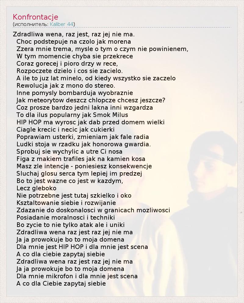 Zdradliwa wena, raz jest, raz jej nie ma. Choc podstepuje na czolo jak morena Zzera mnie trema, mysle o tym o czym nie powinienem, W tym momencie chyba sie przekrece Coraz gorecej i pioro drzy w rece, Rozpoczete dzielo i cos sie zacielo. A ile to juz lat minelo, od kiedy wszystko sie zaczelo Rewolucja jak z mono do stereo. Inne pomysly bombarduja wyobraznie Jak meteorytow deszcz chlopcze chcesz jeszcze? Coz prosze bardzo jedni lakna inni wzgardza To dla ilus popularny jak Smok Milus HIP HOP ma wyrosc jak dab przed domem wielki Ciagle krecic i necic jak cukierki Poprawiam usterki, zmieniam jak fale radia Ludki stoja w rzadku jak honorowa gwardia. Sprobuj sie wychylic a utre Ci nosa Figa z makiem trafiles jak na kamien kosa Masz zle intencje - poniesiesz konsekwencje Sluchaj glosu serca tym lepiej im predzej Bo to jest wazne co jest w kazdym, Lecz gleboko Nie potrzebne jest tutaj szkielko i oko Ksztaltowanie siebie i rozwijanie Zdazanie do doskonalosci w granicach mozliwosci Posiadanie moralnosci i techniki Bo zycie to nie tylko atak ale i uniki Zdradliwa wena raz jest raz jej nie ma Ja ja prowokuje bo to moja domena Dla mnie jest HIP HOP i dla mnie jest scena A co dla ciebie zapytaj siebie Zdradliwa wena raz jest raz jej nie ma Ja ja prowokuje bo to moja domena Dla mnie mikrofon i dla mnie jest scena A co dla Ciebie zapytaj siebie