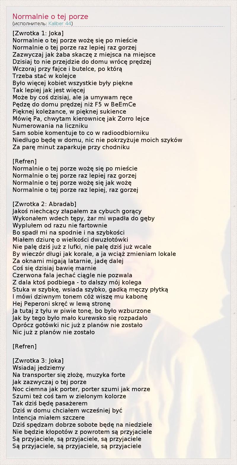 [Zwrotka 1: Joka] Normalnie o tej porze wożę się po mieście Normalnie o tej porze raz lepiej raz gorzej Zazwyczaj jak żaba skaczę z miejsca na miejsce Dzisiaj to nie przejdzie do domu wrócę prędzej Wczoraj przy fajce i butelce, po którą Trzeba stać w kolejce Było więcej kobiet wszystkie były piękne Tak lepiej jak jest więcej Może by coś dzisiaj, ale ja umywam ręce Pędzę do domu prędzej niż F5 w BeEmCe Pięknej koleżance, w pięknej sukience Mówię Pa, chwytam kierownicę jak Zorro lejce Numerowania na liczniku Sam sobie komentuje to co w radioodbiorniku Niedługo będę w domu, nic nie pokrzyżuje moich szyków Za parę minut zaparkuje przy chodniku [Refren] Normalnie o tej porze wożę się po mieście Normalnie o tej porze raz lepiej raz gorzej Normalnie o tej porze wożę się jak wożę Normalnie o tej porze raz lepiej, raz gorzej [Zwrotka 2: Abradab] Jakoś niechcący złapałem za cybuch gorący Wykonałem wdech tępy, żar mi wpadła do gęby Wyplułem od razu nie fartownie Bo spadł mi na spodnie i na szybkości Miałem dziurę o wielkości dwuzłotówki Nie palę dziś już z lufki, nie palę dziś już wcale By wieczór długi jak korale, a ja wciąż zmieniam lokale Za oknami migają latarnie, jadę dalej Coś się dzisiaj bawię marnie Czerwona fala jechać ciągle nie pozwala Z dala ktoś podbiega - to dalszy mój kolega Stuka w szybkę, wsiada szybko, gadką męczy płytką I mówi dziwnym tonem cóż wiszę mu kabonę Hej Peperoni skręć w lewą stronę Ja tutaj z tyłu w piwie tonę, bo było wzburzone Jak by tego było mało kurewsko się rozpadało Oprócz gotówki nic już z planów nie zostało Nic już z planów nie zostało [Refren] [Zwrotka 3: Joka] Wsiadaj jedziemy Na transporter się złożę, muzyka forte Jak zazwyczaj o tej porze Noc ciemna jak porter, porter szumi jak morze Szumi też coś tam w zielonym kolorze Tak dziś będę pasażerem Dziś w domu chciałem wcześniej być Intencja miałem szczere Dziś spędzam dobrze sobote będę na niedziele Nie będzie kłopotów z powrotem są przyjaciele Są przyjaciele, są przyjaciele, są przyjaciele Są przyjaciele, są przyjaciele, są przyjaciele