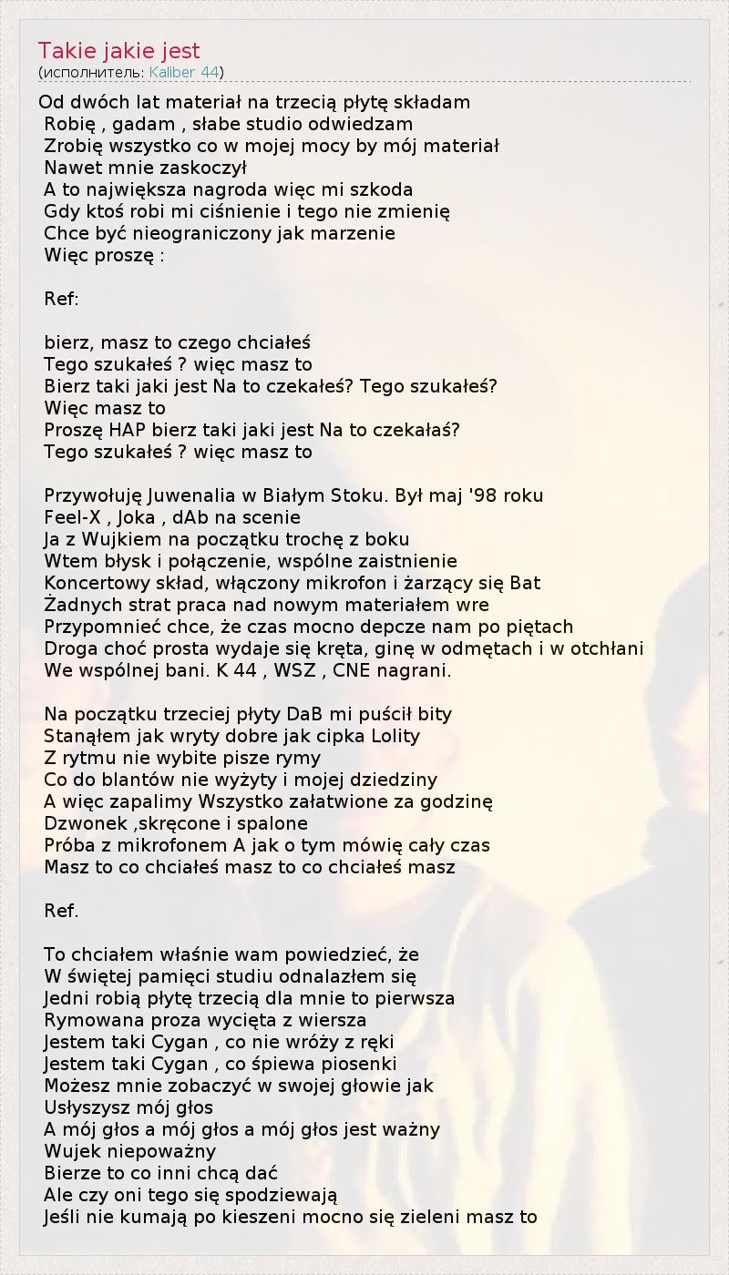 От dwóch лат materiał на trzecią płytę składam Роби, gadam, słabe студия odwiedzam Zrobię Wszystko со ш mojej mocy по mój materiał Nawet mnie zaskoczył Чтобы największa nagroda więc миль szkoda Гды ktoś Роби миль ciśnienie я Tego Nie zmienię Chce być nieograniczony Jak marzenie Więc Proszę: Ссылка: bierz, Masz, чтобы czego chciałeś Tego szukałeś? więc Masz, чтобы Bierz таки Jaki шутка нА до czekałeś? Tego szukałeś? Więc Masz, чтобы Proszę НАР bierz таки Jaki шутка нА до czekałaś? Tego szukałeś? więc Masz, чтобы Przywołuję Juwenalia ж Białym Stoku. Быль майор 98 року Почувствуйте-X Joka, DAB на scenie Я. г Wujkiem на początku trochę г Boku Wtem Błysk я połączenie, wspólne zaistnienie Koncertowy Skład, włączony Mikrofon я żarzący się Bat Żadnych страт Праса над nowym materiałem WRE Przypomnieć chce, że Каталог польских mocno depcze Нам ро piętach Дрога ШОК Prosta wydaje się KRETA, GINE ж odmętach IW otchłani Мы Wspólnej банов. К 44 WSZ, НИК nagrani. На początku trzeciej płyty DaB миль puścił bity Stanąłem Jak wryty Добре Jak cipka Лолиты Z rytmu ние wybite pisze rymy Со сделать blantów некоммерческого характера wyżyty я mojej dziedziny Więc zapalimy Wszystko załatwione ZA godzinę Dzwonek, skręcone я spalone Проба г mikrofonem Jak о тым mówię Cały Каталог польских Masz сотрудничать chciałeś Masz сотрудничать chciałeś Masz Ссылка Для chciałem właśnie WAM powiedzieć, że Вт Świętej pamięci studiu odnalazłem się Jedni Робия płytę trzecią DLA mnie в Pierwsza Rymowana проза wycięta г wiersza Jestem таки Цыган, со Nie wróży г Реки Jestem таки Цыган, со śpiewa piosenki Możesz mnie zobaczyć ж swojej głowie Jak Usłyszysz mój Глосс Mój Глосс mój Глосс mój Глосс шутка ważny Вуек niepoważny Bierze сотрудничать Inni CHCA ЦАП Але Czy ONI Tego się spodziewają Jeśli ние kumają ро kieszeni mocno się Zieleni Masz, чтобы
