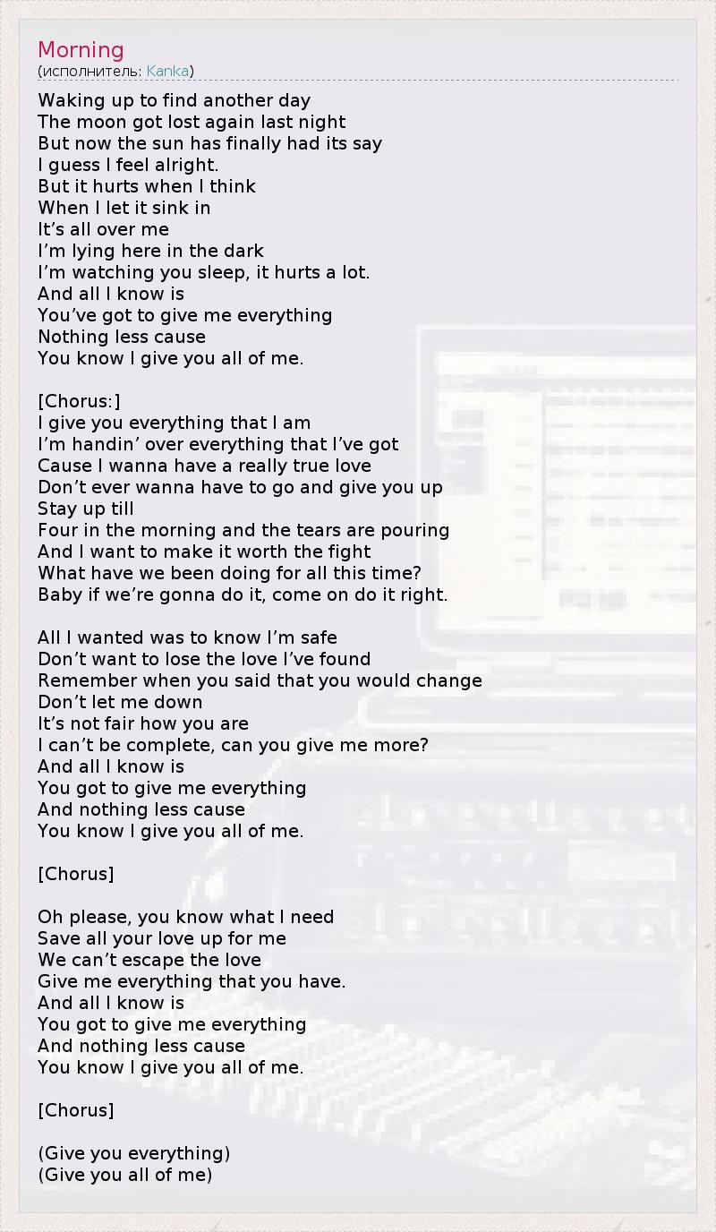 Waking up to find another day The moon got lost again last night But now the sun has finally had its say I guess I feel alright. But it hurts when I think When I let it sink in It’s all over me I’m lying here in the dark I’m watching you sleep, it hurts a lot. And all I know is You’ve got to give me everything Nothing less cause You know I give you all of me. [Chorus:] I give you everything that I am I’m handin’ over everything that I’ve got Cause I wanna have a really true love Don’t ever wanna have to go and give you up Stay up till Four in the morning and the tears are pouring And I want to make it worth the fight What have we been doing for all this time? Baby if we’re gonna do it, come on do it right. All I wanted was to know I’m safe Don’t want to lose the love I’ve found Remember when you said that you would change Don’t let me down It’s not fair how you are I can’t be complete, can you give me more? And all I know is You got to give me everything And nothing less cause You know I give you all of me. [Chorus] Oh please, you know what I need Save all your love up for me We can’t escape the love Give me everything that you have. And all I know is You got to give me everything And nothing less cause You know I give you all of me. [Chorus] (Give you everything) (Give you all of me)