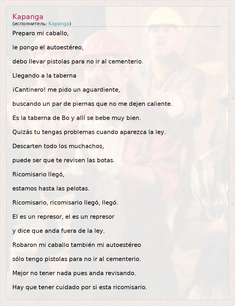 Preparo mi caballo, le pongo el autoestéreo, debo llevar pistolas para no ir al cementerio. Llegando a la taberna ¡Cantinero! me pido un aguardiente, buscando un par de piernas que no me dejen caliente. Es la taberna de Bo y allí se bebe muy bien. Quizás tu tengas problemas cuando aparezca la ley. Descarten todo los muchachos, puede ser que te revisen las botas. Ricomisario llegó, estamos hasta las pelotas. Ricomisario, ricomisario llegó, llegó. El es un represor, el es un represor y dice que anda fuera de la ley. Robaron mi caballo también mi autoestéreo sólo tengo pistolas para no ir al cementerio. Mejor no tener nada pues anda revisando. Hay que tener cuidado por si esta ricomisario.